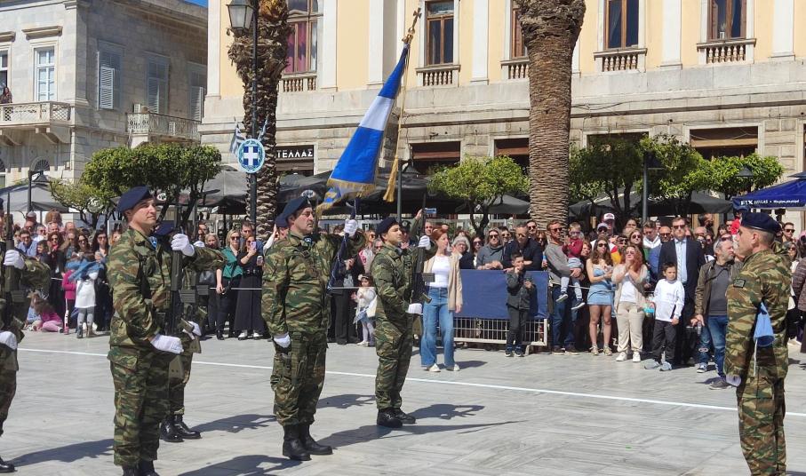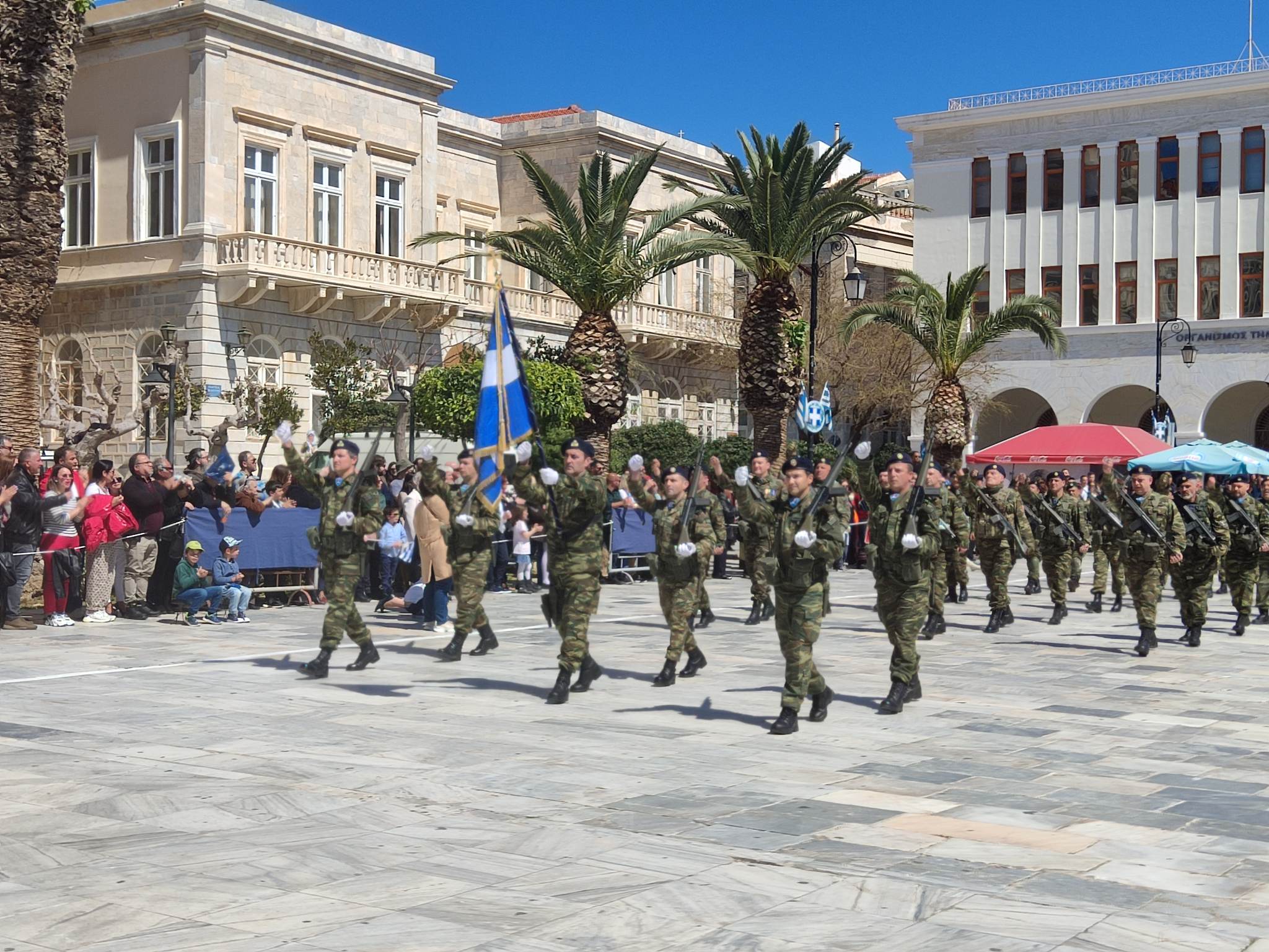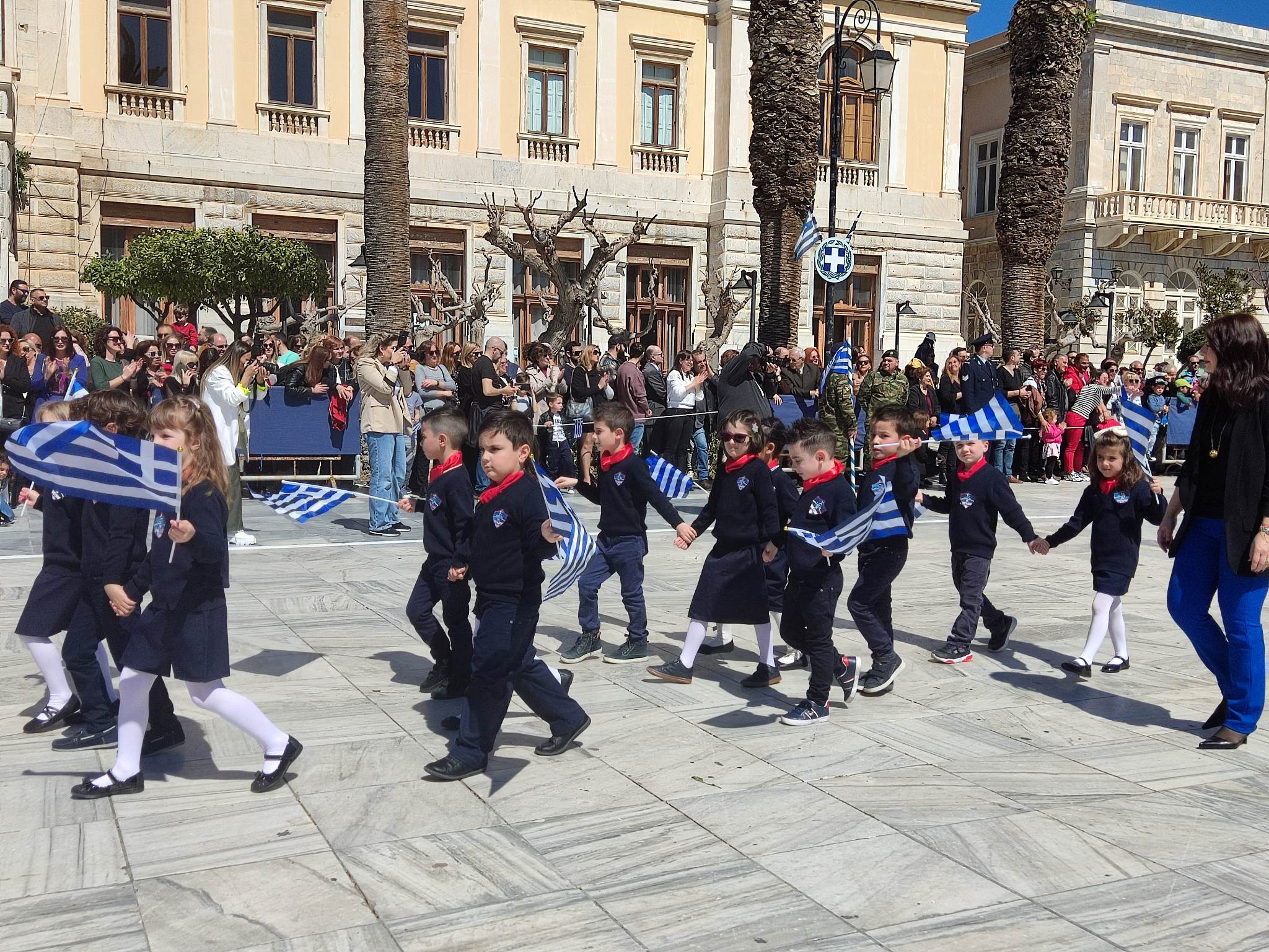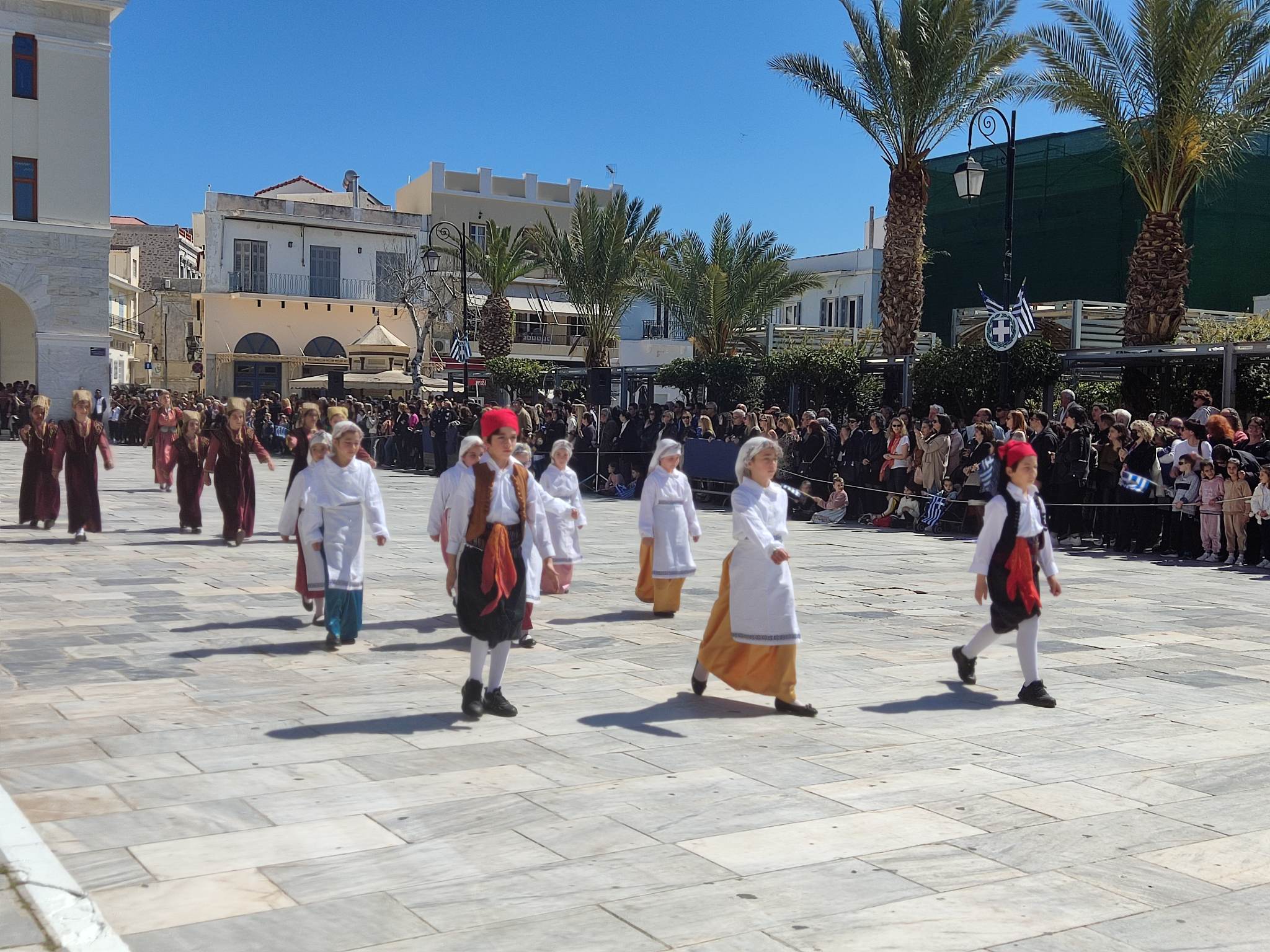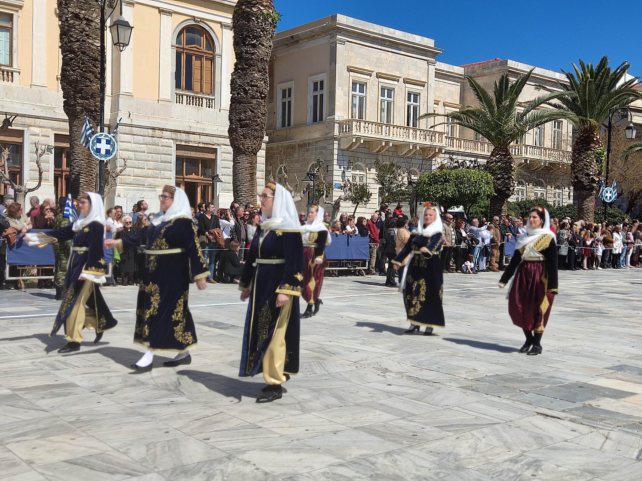 Αμέσως μετά, νέοι και νέες παρέλασαν στην πλατεία Μιούλη, υπό την “καθοδήγηση” της Φιλαρμονικής, με πλήθος κόσμου να παρακολουθεί, ενώ νωρίτερα το πρωί έλαβε χώρα η αποκάλυψη της πολεμικής σημαίας από το ΤΕΘ Ερμούπολης έμπροσθεν του ανδριάντα του Ναυάρχου Μιαούλη..