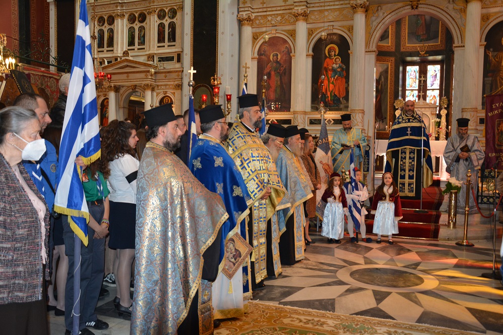 Η επίσημη δοξολογία τελέστηκε στον Ι.Ν. Αγίου Νικολάου εκφώνηση του πανηγυρικού της ημέρας μετά έγινε από την επικοινωνιολόγο – δημοσιογράφο κα Φλώρα Μπαρμπέτα, η οποία άρχισε τον λόγο της, αναφέροντας πως ”η Ελλάδα σήμερα γιορτάζει με μία διπλή γιορτή. Θρησκεία και έθνος σκέψη και υπόσταση, ψυχή και πνεύμα, καρδιά και λογική, ιστορία και μέλλον”. Κάνοντας μία σύντομη ιστορική αναφορά στα γεγονότα της Ελληνικής Επανάστασης και στις δυσκολίες και τις προκλήσεις που αντιμετώπισαν οι πρόγονοί μας στον αγώνα τους για την ελευθερία, η κα. Μπαρμπέτα τόνισε: “Πόσο νιώθουμε, πόσο αντιλαμβανόμαστε, πόσο γνωρίζουμε, πόσο σεβόμαστε τα γεγονότα που διαδραματίστηκαν 200 χρόνια πριν; Πόσο μας επηρεάζουν στην καθημερινή μας ζωή; Πόσο βαρεθήκαμε ή κουραστήκαμε να τα ακούμε; Πόσο τα σνομπάρουμε αλλά και πόσο χρειάζεται να τα οικειοποιηθούμε, να τα ενστερνιστούμε και να τα αγαπήσουμε για να συνεχίσουμε να υπάρχουμε μέσα στη δίνη του παγκοσμιοποιημένου 21ου αιώνα; Σε ποιο βαθμό διδασκόμαστε και αναλύουμε την ιστορία μας σήμερα στα σχολεία, στα πανεπιστήμια ; Σκεφτείτε να είχε χαθεί η γλώσσα μας , η γραφή μας, να είχαν χαθεί οι παραδόσεις μας, τα ήθη κι έθιμά μας. Χωρίς εθνική ταυτότητα δεν υπάρχει περιθώριο κοινωνικής ή ατομικής επιβίωσης” ανέφερε, μεταξύ άλλων, η κα.Μπαρμπέτα και ολοκληρώνοντας το λόγο της, προέτρεψε τη γενιά που τώρα παραδίδει τη σκυτάλη στους νεότερους: “Στην εποχή της τεχνητής νοημοσύνης εμείς οφείλουμε να αγκαλιάσουμε την εξέλιξη, την επιστήμη, την τεχνολογία, χορεύοντας με την ιστορία”.
