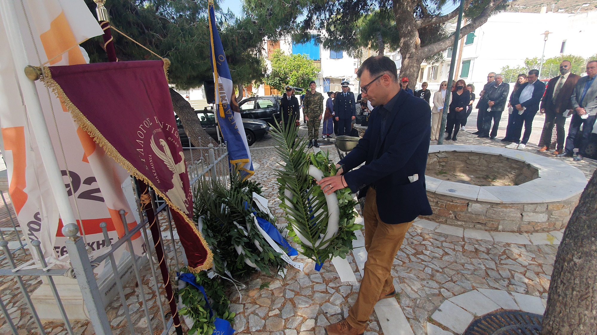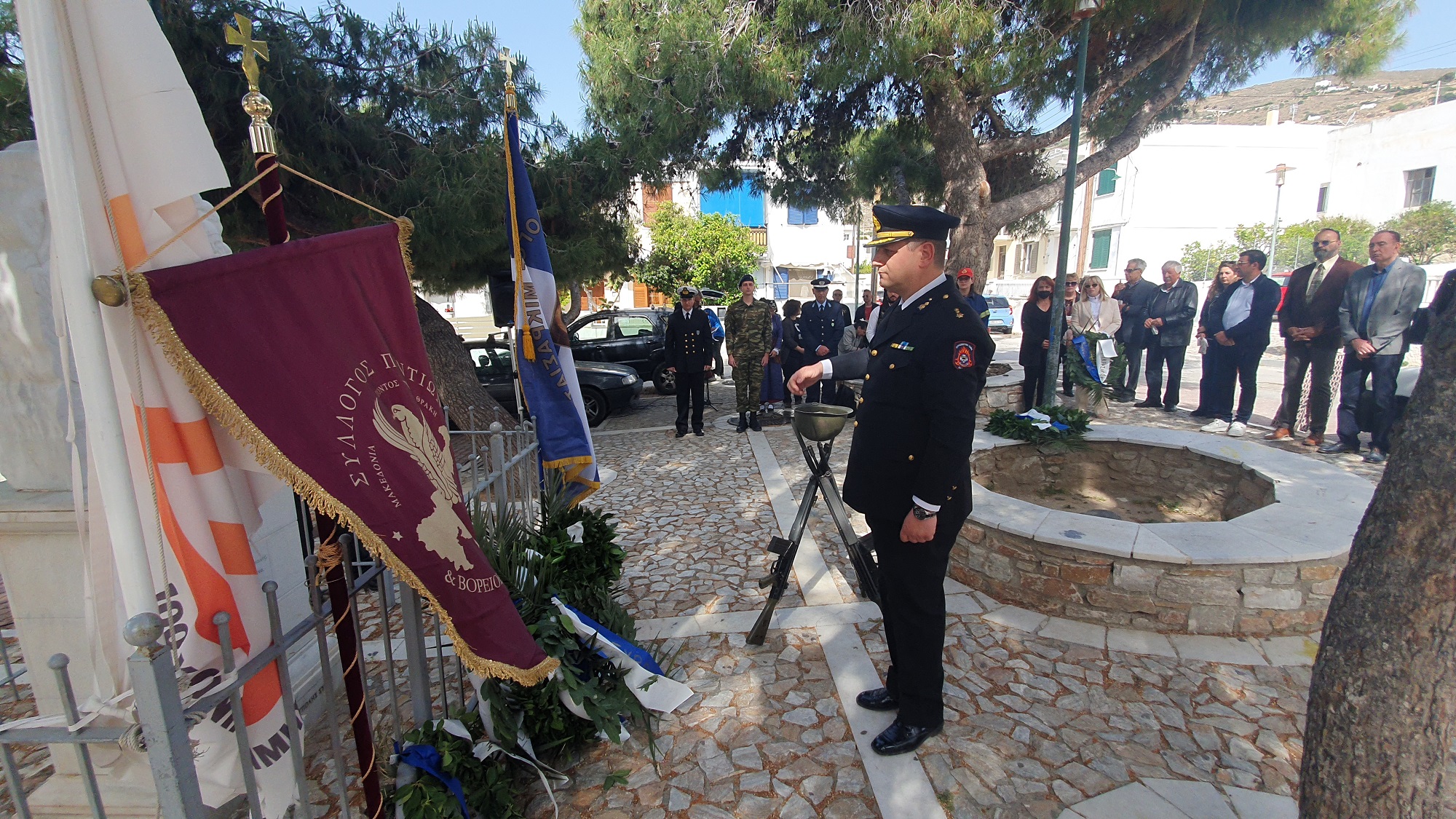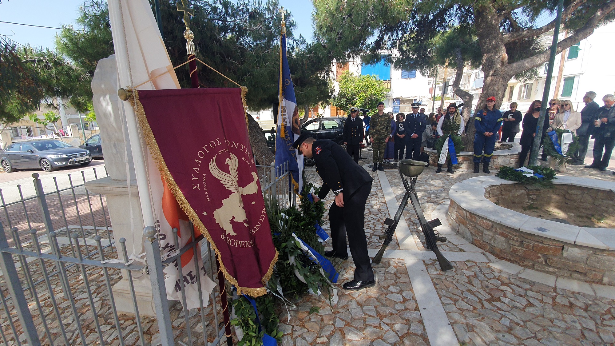 Μετά το πέρας της δοξολογίας πραγματοποίησε ομιλία, ο πρόεδρος του Συλλόγου Ποντίων και Βορειοελλαδιτών Σύρου «Ο Εύξεινος Πόντος», Νικόλαος Καρυοφυλλίδης, ο οποίος εμφανώς συγκινημένος, μεταξύ άλλων, ανέφερε πως "έχουμε δικαίωμα στην συγνώμη, δικαίωμα στην αποδοχή της αλήθειας. Η διεθνής αναγνώριση της γενοκτονίας των Ποντίων είναι αδιαπραγμάτευτη και επιβάλλεται και αποτελεί στόχο όλων μας. Θα κλείσω με μία υπόσχεση. Δεν ξεχνώ. Και με μία ευχή. Ποτέ ξανά".