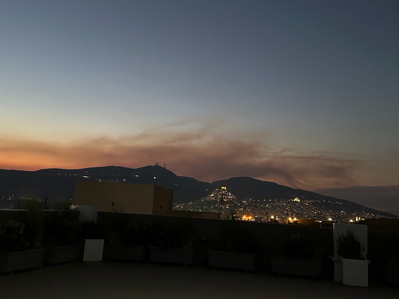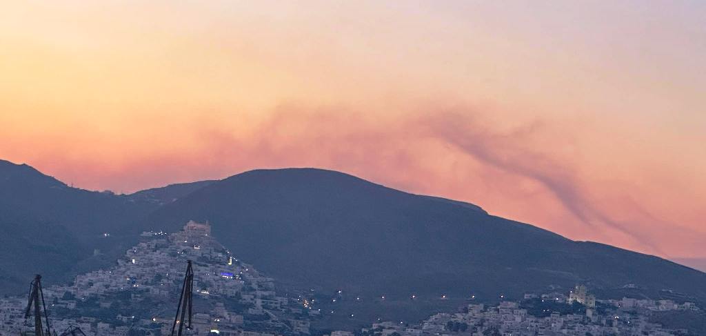 Το τεράστιο μέτωπο των πυρκαγιών σε συνδυασμό με τους ισχυρούς ανέμους έχουν ως αποτέλεσμα οι καπνοί να έχουν φτάσει ήδη πάνω από την Ερμούπολη της Σύρου, ενώ όσο περνάει η ώρα γίνεται όλο και πιο έντονη η οσμή του καμένου.