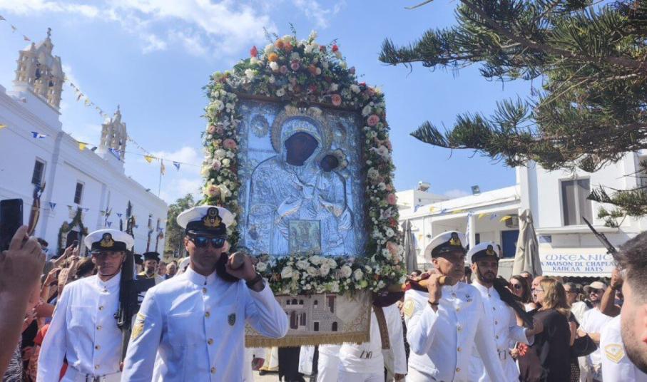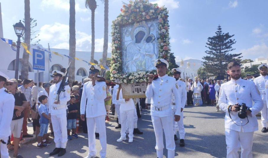 Κατόπιν, ακολούθησε η περιφορά της Ιερής Εικόνας, καθώς πιστοί και προσκυνητές συνόδευσαν με ευλάβεια την Παναγία μέχρι το λιμάνι του νησιού, όπου τα πλοία υποδέχτηκαν, με τις κόρνες τους, την Ιερά Εικόνα του νησιού.