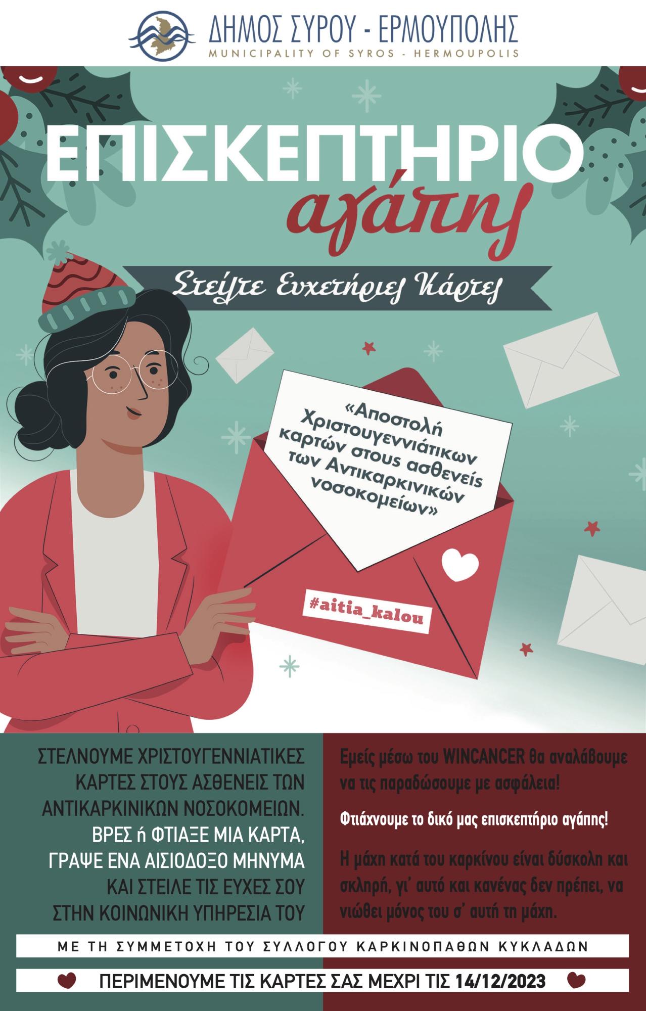 Για μία ακόμη χρονιά στην εορταστική περίοδο των Χριστουγέννων αναμένεται να λάβει χώρα το “Επισκεπτήριο Αγάπης”, μέσω του τμήματος Κοινωνικής Προστασίας του Δήμου Σύρου- Ερμούπολης, όπου ευχητήριες κάρτες παιδιών αναμένεται να σταλούν σε συνανθρώπους μας που αντιμετωπίζουν σοβαρά προβλήματα υγείας.