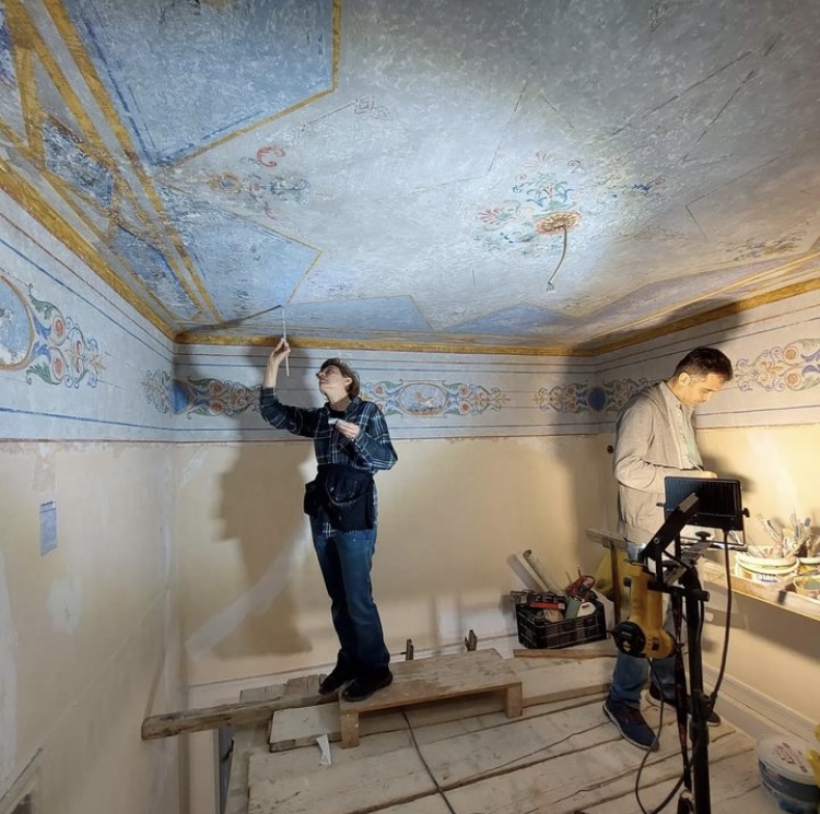 Πόσος χρόνος απαιτείται, αλήθεια, για να αποκαλυφθεί και να αποκατασταθεί μία οροφογραφία; «Όταν ξεκινήσεις αυτή τη διαδικασία, μπορεί να συναντήσεις κρεμασμένα ταβάνια, οπότε να πρέπει πρώτα να κάνεις στερεώσεις, υποστυλώσεις, συμπληρώσεις. Για δύο με τρεις περίπου εβδομάδες είμαστε “στον αέρα” και προετοιμάζουμε την οροφή», λέει η Αγγελική. «Από κει και πέρα, το ευχάριστο, πιο “καθαρό” και γοητευτικό κομμάτι της δουλειάς, η αποκατάσταση, μας παίρνει δύο εβδομάδες».