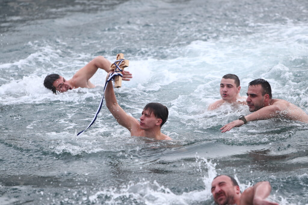 Δεκάδες κολυμβητές βούτηξαν στον Θερμαϊκό για τον Τίμιο Σταυρό, με τον μητροπολίτη Θεσσαλονίκης να τους δίνει την ευλογία του. Ο 20χρονος φοιτητής Στέργιος Παγωνίδης ήταν αυτός, που έπιασε πρώτος τον Τίμιο Σταυρό.