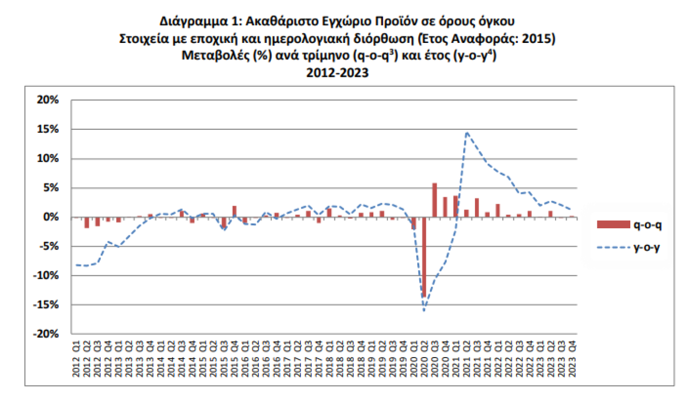 Σύμφωνα με τα στοιχεία που ανακοινώθηκαν, σημειώθηκε ανάπτυξη 2% για το 2023 και αύξηση 1,2% στο τελευταίο τετράμηνο σε σχέση με πέρσι.