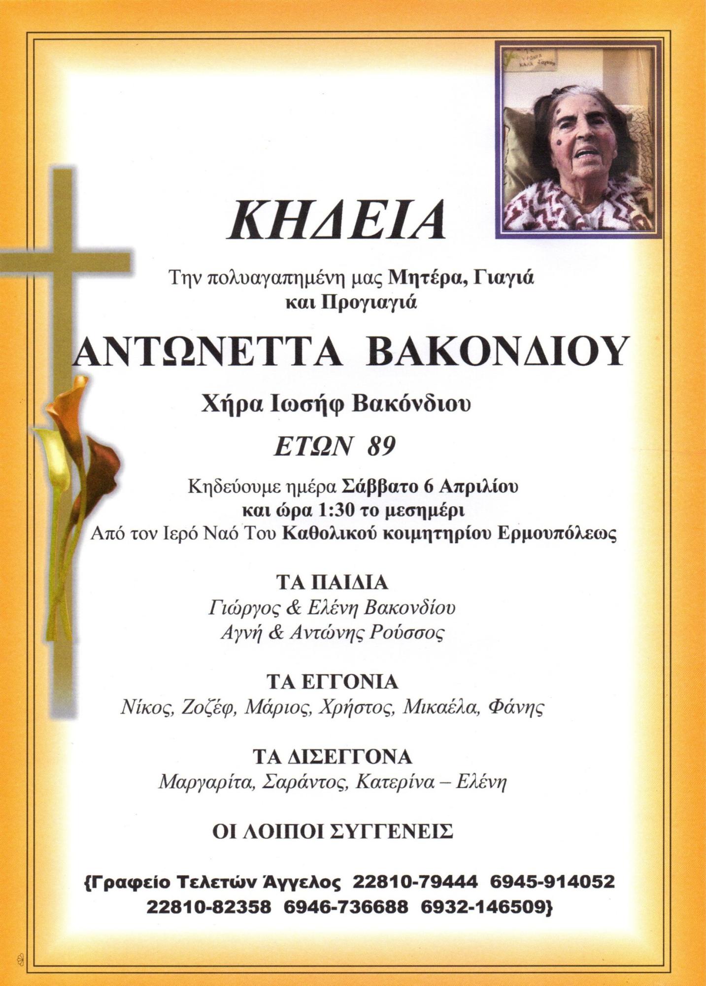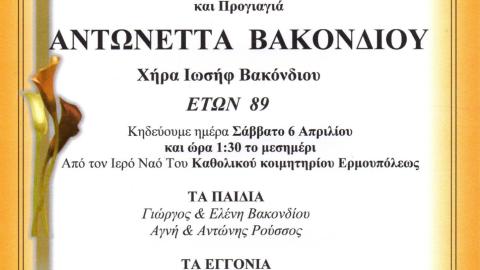 Έφυγε από τη ζωή το μεσημέρι της Παρασκευής, η Αντωνέττα Βακονδίου (χήρα του Ιωσήφ Βακόνδιου), σε ηλικία 89 ετών, μετά από σύντομη νοσηλεία της στο Νοσοκομείο της Σύρου.