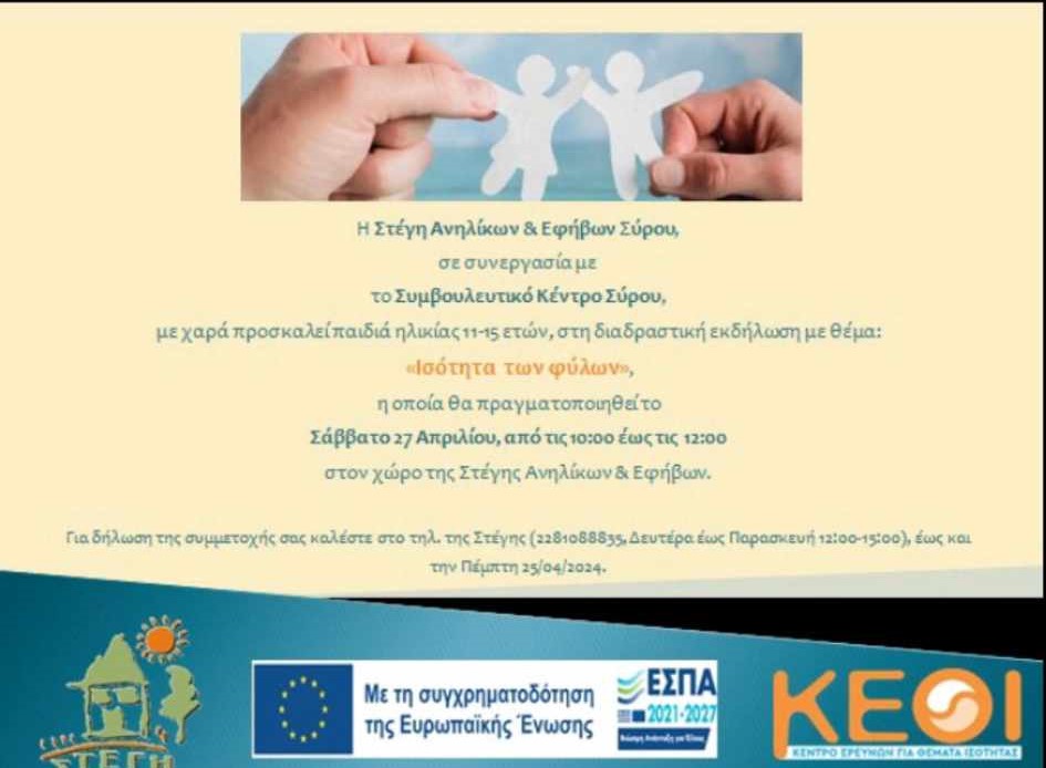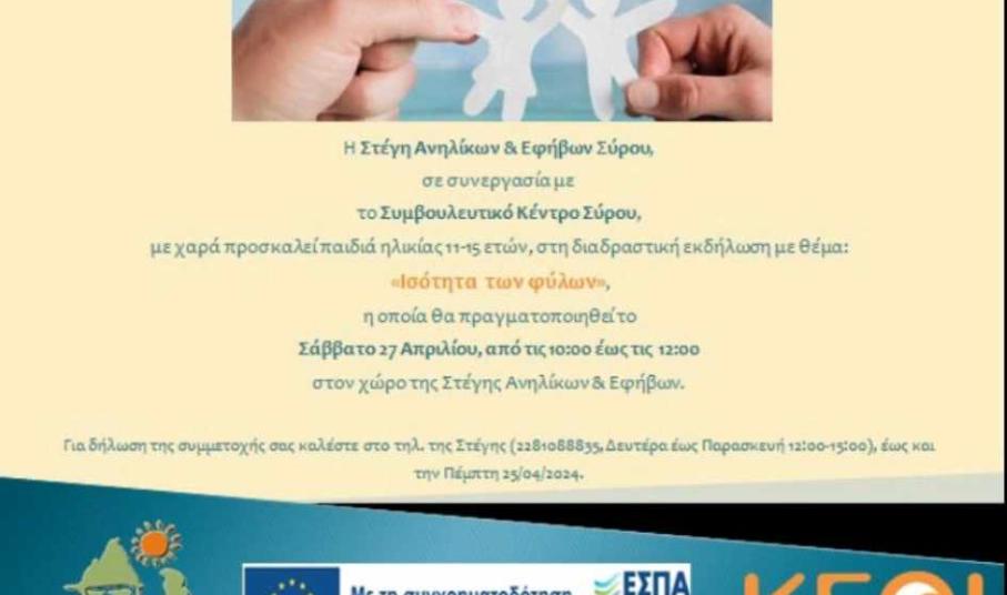 Η Στέγη Ανηλίκων Σύρου συνεχίζοντας τις δράσεις της για την ενημέρωση, αλλά και ευαισθητοποίηση των παιδιών και των ενηλίκων, με στόχο την ενδυνάμωση του κοινωνικού συνόλου, διοργανώνει το Σάββατο 27 Απριλίου μία διαδραστική εκδήλωση με θέμα "Ισότητα των φύλων".