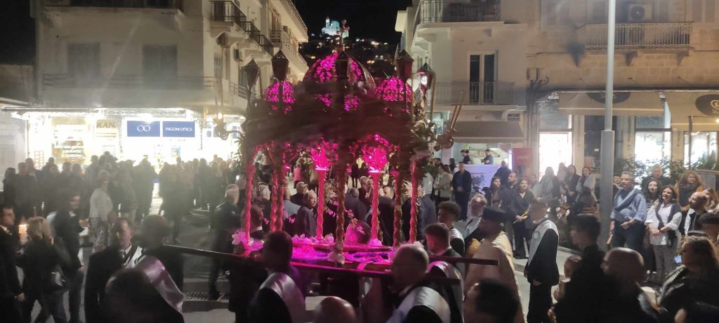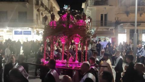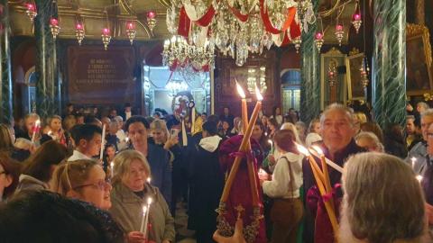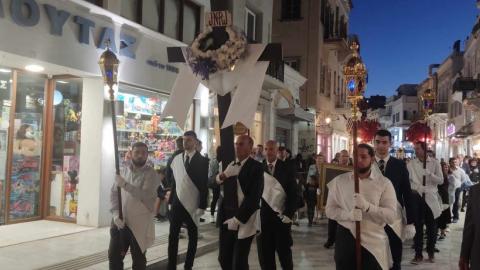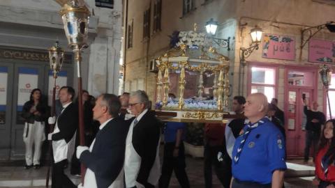Την ιερή λιτανεία "άνοιξε" η περιφορά του Επιταφίου του Ιερού Ναού Ευαγγελιστρίας Ερμουπόλεως, της Καθολικής Εκκλησίας, η οποία λάμπρυνε τους δρόμους του ιστορικού κέντρου. Πλήθος πιστών κατέκλυσαν το ναό και τους εξωτερικούς χώρους, για να παρακολουθήσουν την Ακολουθία των Αγίων Παθών του Κυρίου, μέσα σε κατανυκτική και συγκινητική ατμόσφαιρα υπό τους ύμνους που έψαλε η πολυφωνική χορωδία της ενορίας. Ανάμεσά τους ο δήμαρχος Σύρου-Ερμούπολης, Αλέξης Αθανασίου, εκπρόσωποι της αυτοδιοίκησης, αλλά και των αρχών του τόπου, οι οποίοι συμμετείχαν και στην περιφορά του Επιτάφιου, βασταζόμενου στους ώμους νέων. Η λιτάνευση του επιταφίου τράβηξε τα βλέμματα εκατοντάδων επισκεπτών που είχαν συγκεντρωθεί στην πλατεία Μιαούλη απ’ όπου διέρχεται.