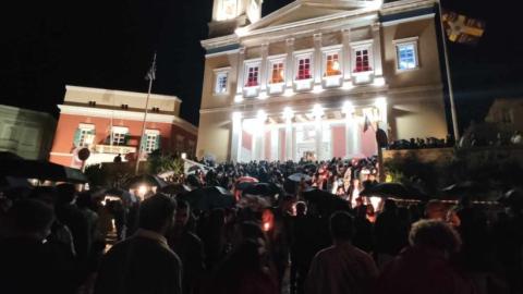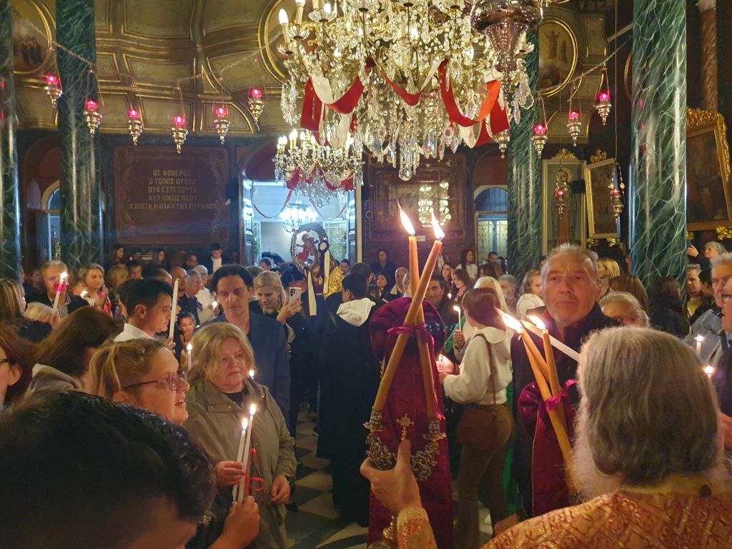Το φθινοπωρινό σκηνικό που διαμορφώθηκε το βράδυ του Μεγάλου Σαββάτου, δεν στάθηκε ικανό να αποτρέψει το αναστάσιμο μήνυμα που δόθηκε με χαρμόσυνες κωδωνοκρουσίες από όλους τους ναούς της Σύρου, οι οποίοι κυριολεκτικά γέμισαν ασφυκτικά από χιλιάδες πιστούς.