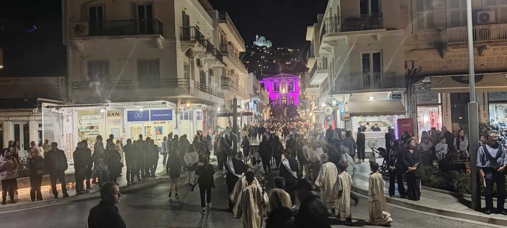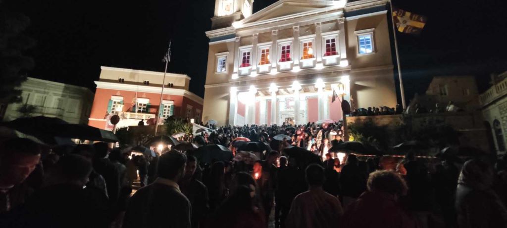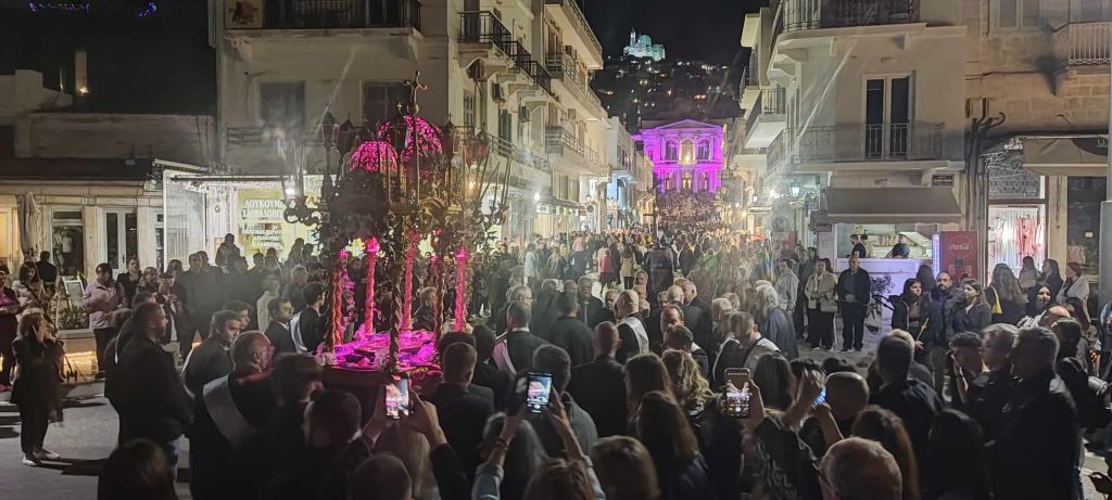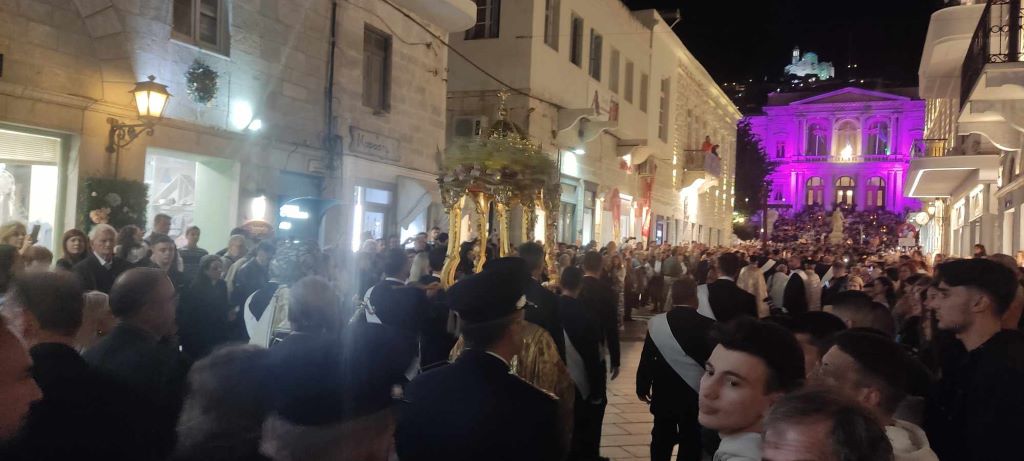 Λίγη λεπτά μετά τις 9 το βράδυ, χιλιάδες πιστοί κατέκλυσαν ασφυκτικά τους δρόμους της Ερμούπολης, συμμετέχοντας στην μεγαλοπρεπή συνάντηση των επιταφίων των ναών Μεταμορφώσεως του Σωτήρος, Κοιμήσεως της Θεοτόκου και Αγίου Νικολάου.