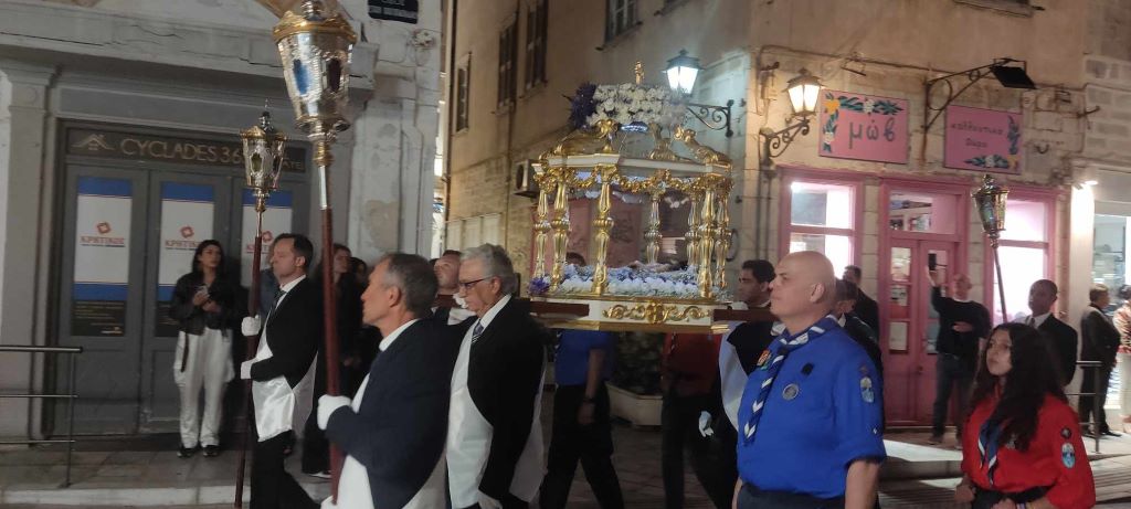 Τη λιτάνευση πλαισίωσε η Φιλαρμονική του Δήμου Σύρου – Ερμούπολης, παιανίζοντας πένθιμα εμβατήρια, υπό τη διεύθυνση της αρχιμουσικού Alice Labarche.
