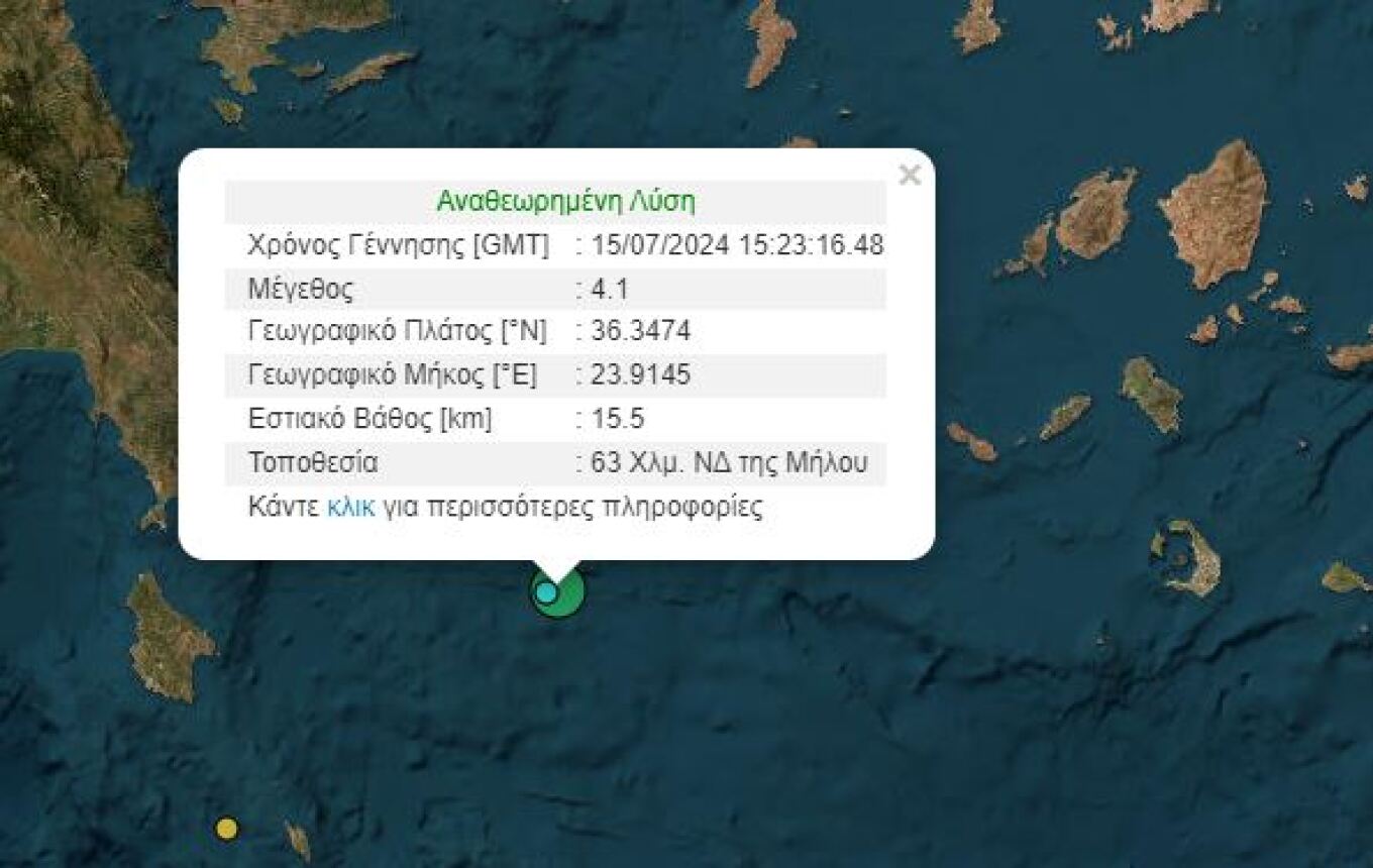 Σεισμός σημειώθηκε το απόγευμα της Δευτέρας (15/7) στις 18.23 σε θαλάσσια περιοχή ανοιχτά της Μήλου.