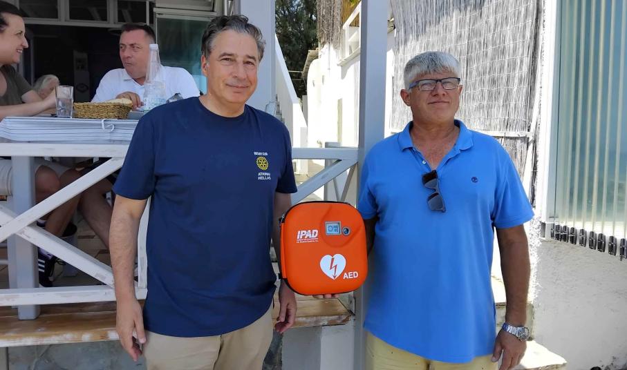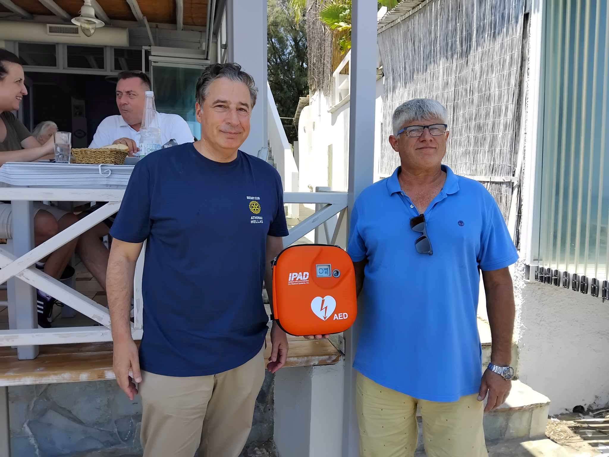 Ο αυτόματος απινιδωτής που σκοπό έχει την κάλυψη τυχόν περιπτώσεων έκτακτης ανάγκης της περιοχής και που εγκαταστάθηκε στον εξωτερικό χώρο του καταστήματος εστίασης "Ο Κοντός στου Ραφογιάννη", αποτελεί μία προσφορά του Ροταριανού Ομίλου Αθήνας.