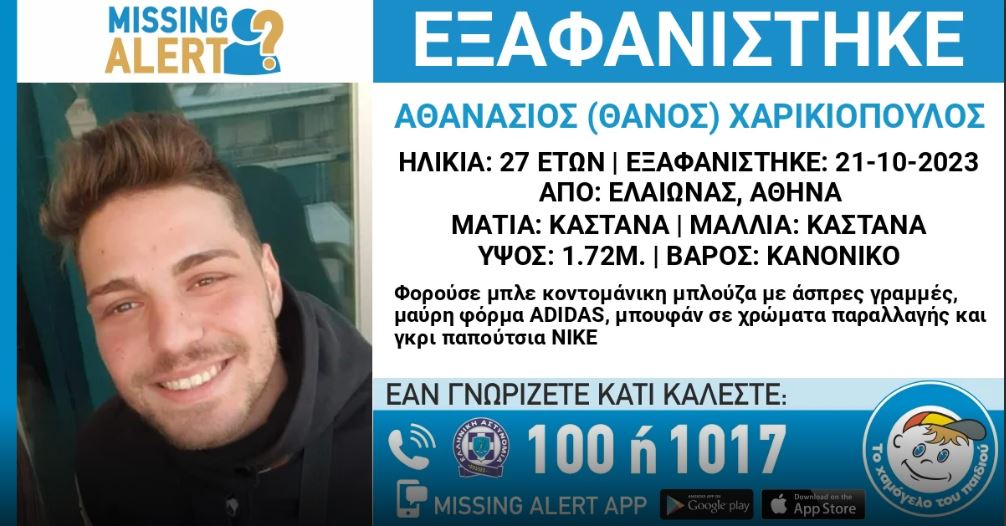 Ο Χαρικιόπουλος Αθανάσιος, 27 ετών, εξαφανίστηκε στις 21/10/2023 από την περιοχή του Ελαιώνα στην Αθήνα. Το «Χαμόγελο του Παιδιού» ενημερώθηκε για την εξαφάνιση του Χαρικιόπουλου Αθανάσιου στις 24/10/2023 και άμεσα προχώρησε στη δημοσιοποίηση των στοιχείων του ενήλικου, κατόπιν αιτήματος των οικείων του, καθώς ενδέχεται να συντρέχουν σοβαροί λόγοι οι οποίοι θέτουν τη ζωή του σε κίνδυνο.