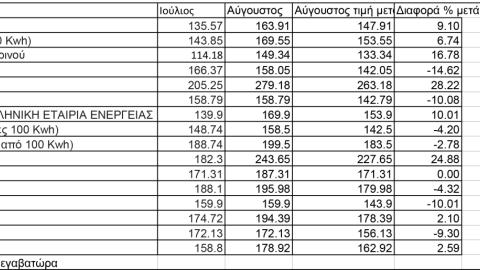 Σύμφωνα με τα στοιχεία της Ρυθμιστικής Αρχής, 7 από τα 16 τιμολόγια που ισχύουν αυτόν το μήνα είναι μειωμένα έως και 14 % σε σχέση με τον Ιούλιο, ένα παρέμεινε στο ίδιο επίπεδο ενώ τα υπόλοιπα 8 είναι αυξημένα έως 28%.