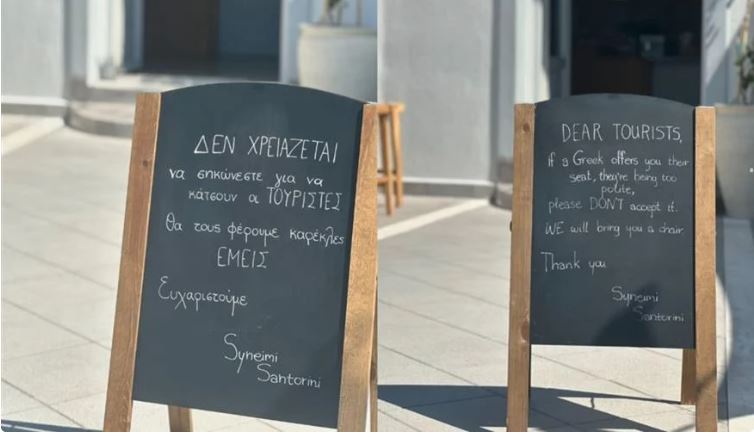 Με φόντο τον υπερτουρισμό στα ελληνικά νησιά, ένα κατάστημα στη Σαντορίνη βάζει όρια στην περίφημη ελληνική φιλοξενία με έναν έξυπνο τρόπο. Ο ιδιοκτήτης του καταστήματος έγραψε ένα μήνυμα προς τους πελάτες περνώντας έτσι το δικό του μήνυμα.