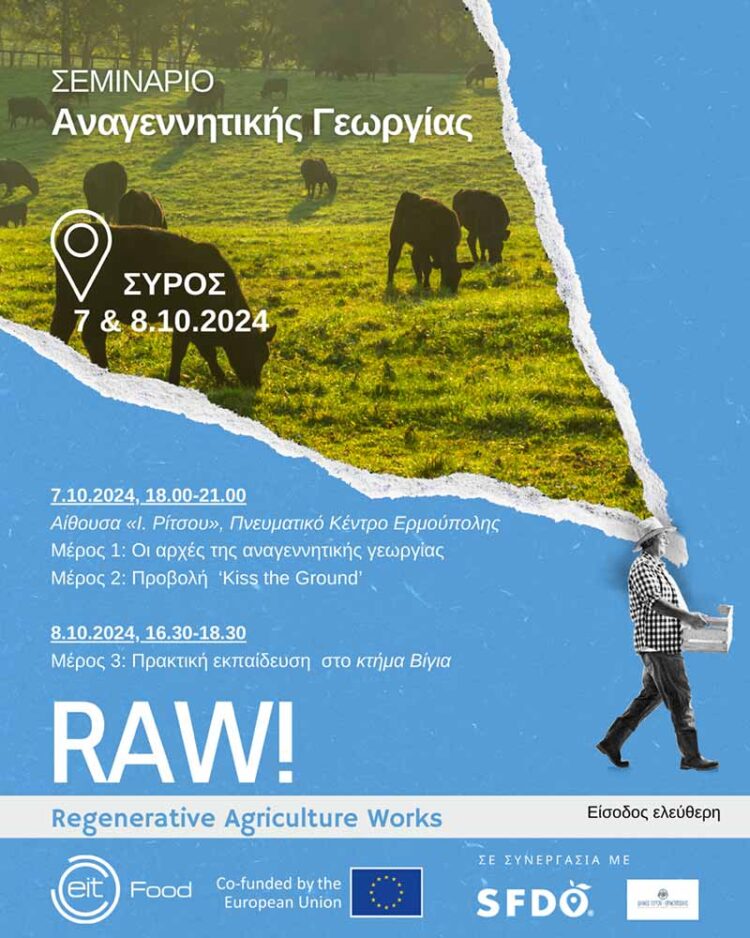 Το σεμινάριο, που στοχεύει στην ενημέρωση και υποστήριξη των αγροτών στην υιοθέτηση βιώσιμων γεωργικών πρακτικών, θα πραγματοποιηθεί στο Πνευματικό Κέντρο της Ερμούπολης και διοργανώνεται από τον Οργανισμό Βιώσιμου Διατροφικού Προορισμού (SFDO), σε συνεργασία με το EIT Food, στο πλαίσιο του ευρωπαϊκού προγράμματος Regenerative Agriculture Works (RAW).