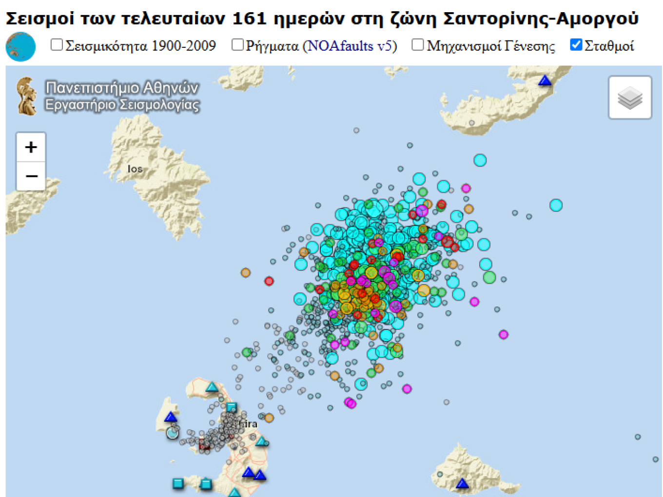 Το Εργαστήριο Σεισμολογίας του Τμήματος Γεωλογίας και Γεωπεριβάλλοντος του ΕΚΠΑ παρακολουθεί σε πραγματικό χρόνο την εξέλιξη της σεισμικής δραστηριότητας στο ηφαιστειακό σύμπλεγμα της Σαντορίνης, καθώς και στη ζώνη Σαντορίνης – Αμοργού, πλησίον της νησίδας Ανύδρου.
