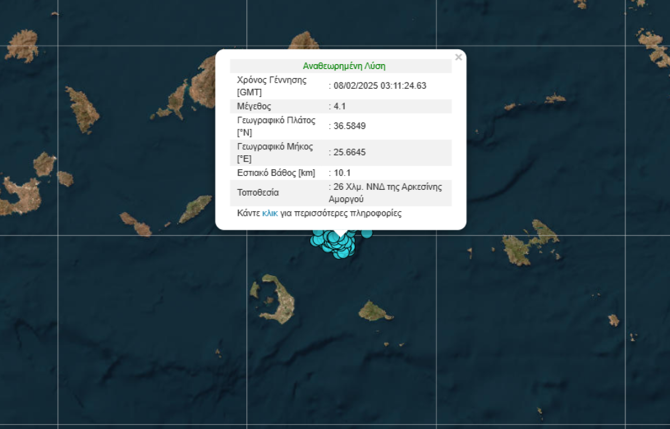 Στις 3.52 μετά τα μεσάνυχτα σημειώθηκε σεισμός 4,4 βαθμών Ρίχτερ 17 χιλιόμετρα νότια νοτιοδυτικά της Αρκεσίνης Αμοργού με το εστιακό του βάθος να είναι 9,6 χιλιόμετρα. Ακολούθησαν μέσα σε τρία λεπτά δύο σεισμοί 4,1 Ρίχτερ (στις 5.08 και 5.11).