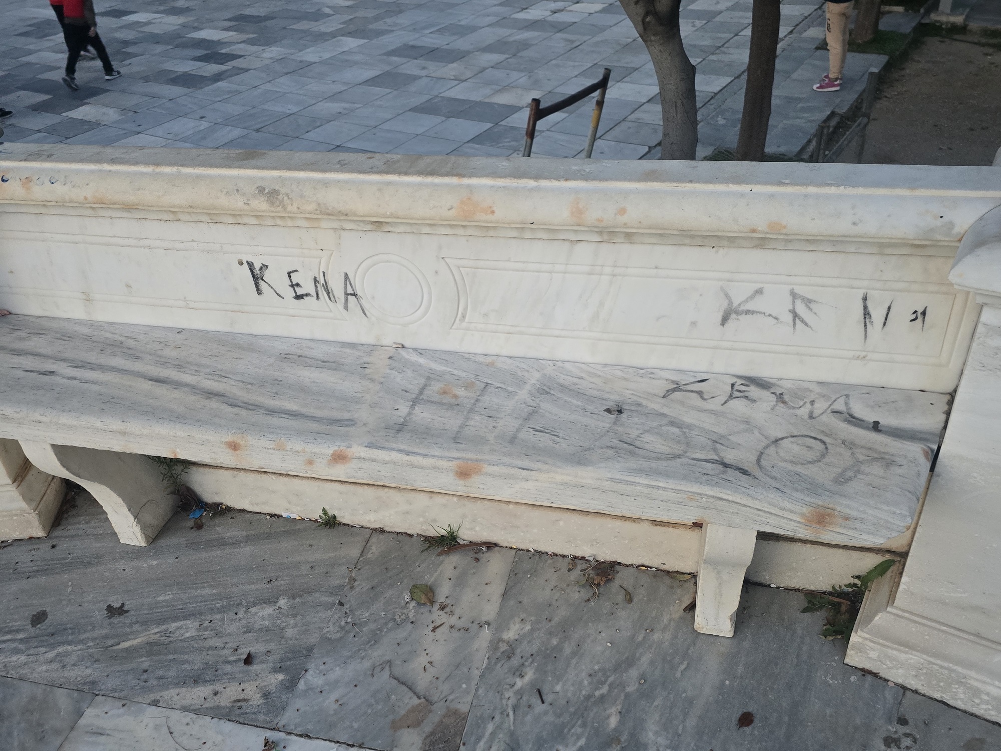Από αυτή την άσχημη "μόδα", δεν μπόρεσε να γλιτώσει ούτε η ιστορική μαρμάρινη εξέδρα, έργο του γλύπτη Ιωάννη Βιτάλη, με χορηγία του μεγαλέμπορου Θεόδωρου Πάγκαλου (1833 – 1915), που βρίσκεται πλησίον του αγάλματος του Μιαούλη στην κεντρική πλατεία του νησιού, ακριβώς απέναντι από το Δημαρχείο.