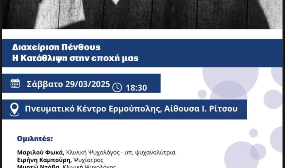 Με κεντρικό στόχο την ευαισθητοποίηση και η ενημέρωση του κοινού, καθώς και η παροχή χρήσιμων πληροφοριών για την κατανόηση, την πρόληψη και τη διαχείριση αυτών των καταστάσεων, διοργανώνεται αύριο, Σάββατο στις 6 και μισή το απόγευμα στη Σύρο, ομιλία με θέμα την κατάθλιψη και τη διαχείριση του πένθους.