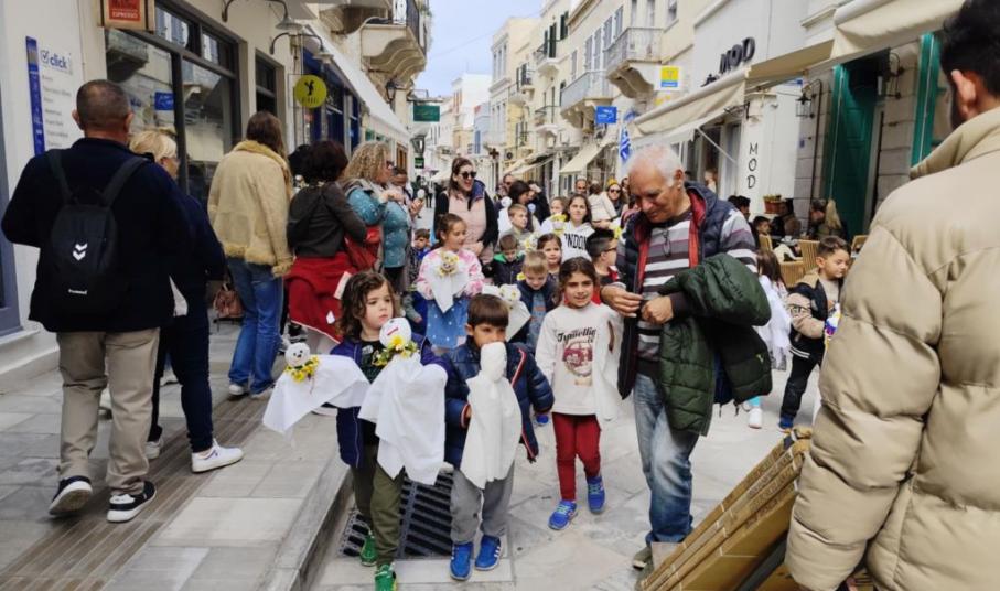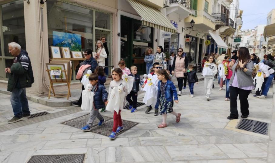 Αυτό έπραξαν τα παιδιά από το παιδικό και εφηβικό τμήμα του Παραδοσιακού Εργαστηρίου Σύρου "Άρωμα Παράδοσης", όπου κρατώντας λαζαράκια στα χέρια τους, σκόρπισαν την παράδοση στους δρόμους του κέντρου.