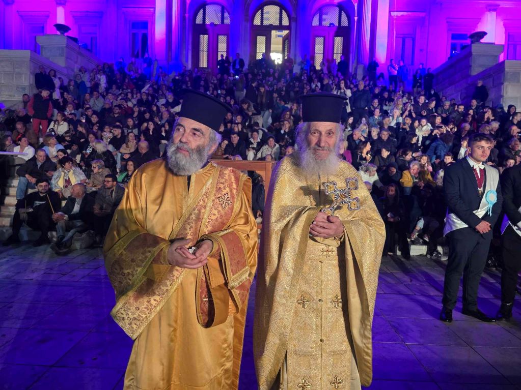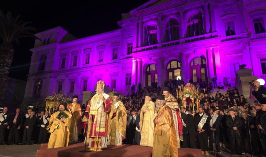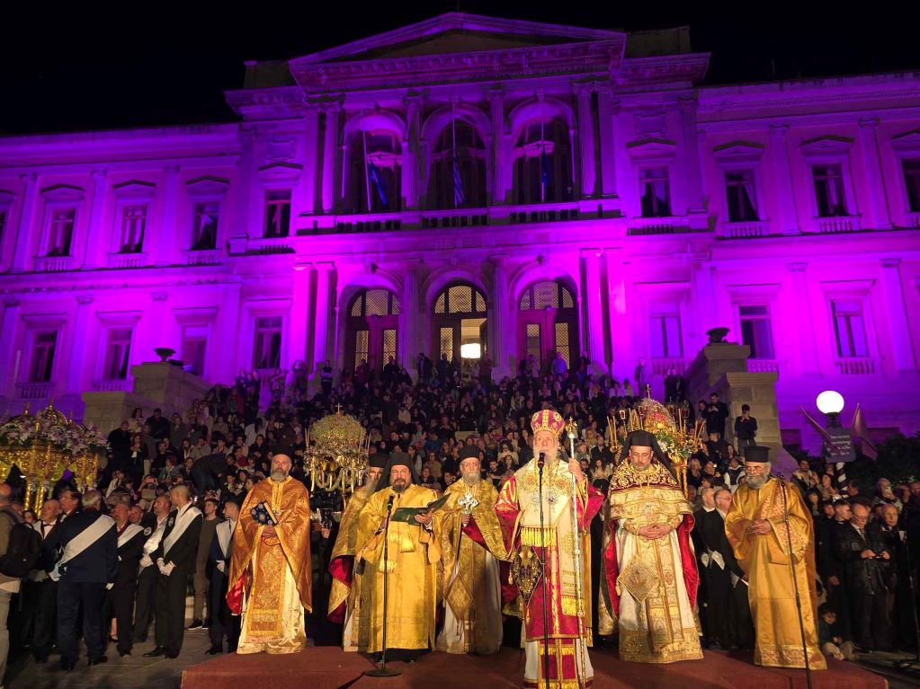 Η περιφορά των επιταφίων, διασχίζοντας τους δρόμους και τα στενά του ιστορικού κέντρου, κατέληξαν στην πλατεία Μιαούλη, όπου ο Σεβασμιώτατος Μητροπολίτης Σύρου κ. Δωρόθεος Β΄ μετά από την ολοκλήρωση της ιερής δέησης, εκφώνησε ομιλία παρουσία εκπροσώπων της πολιτείας, της αυτοδιοίκησης α΄ και β΄ βαθμού, των Σωμάτων Ασφαλείας και πιστών.
