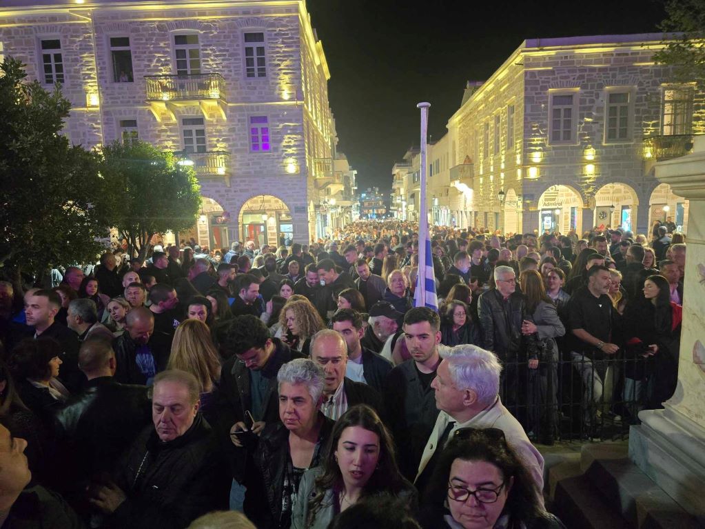 Με θρησκευτική ευλάβεια, κατάνυξη και υπό των ήχων των πένθιμων εμβατηρίων της Φιλαρμονικής του Δήμου Σύρου – Ερμούπολης, πραγματοποιήθηκε η λιτάνευση των τριών επιταφίων στο κέντρο της Ερμούπολης.