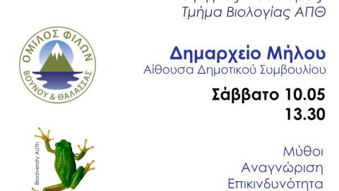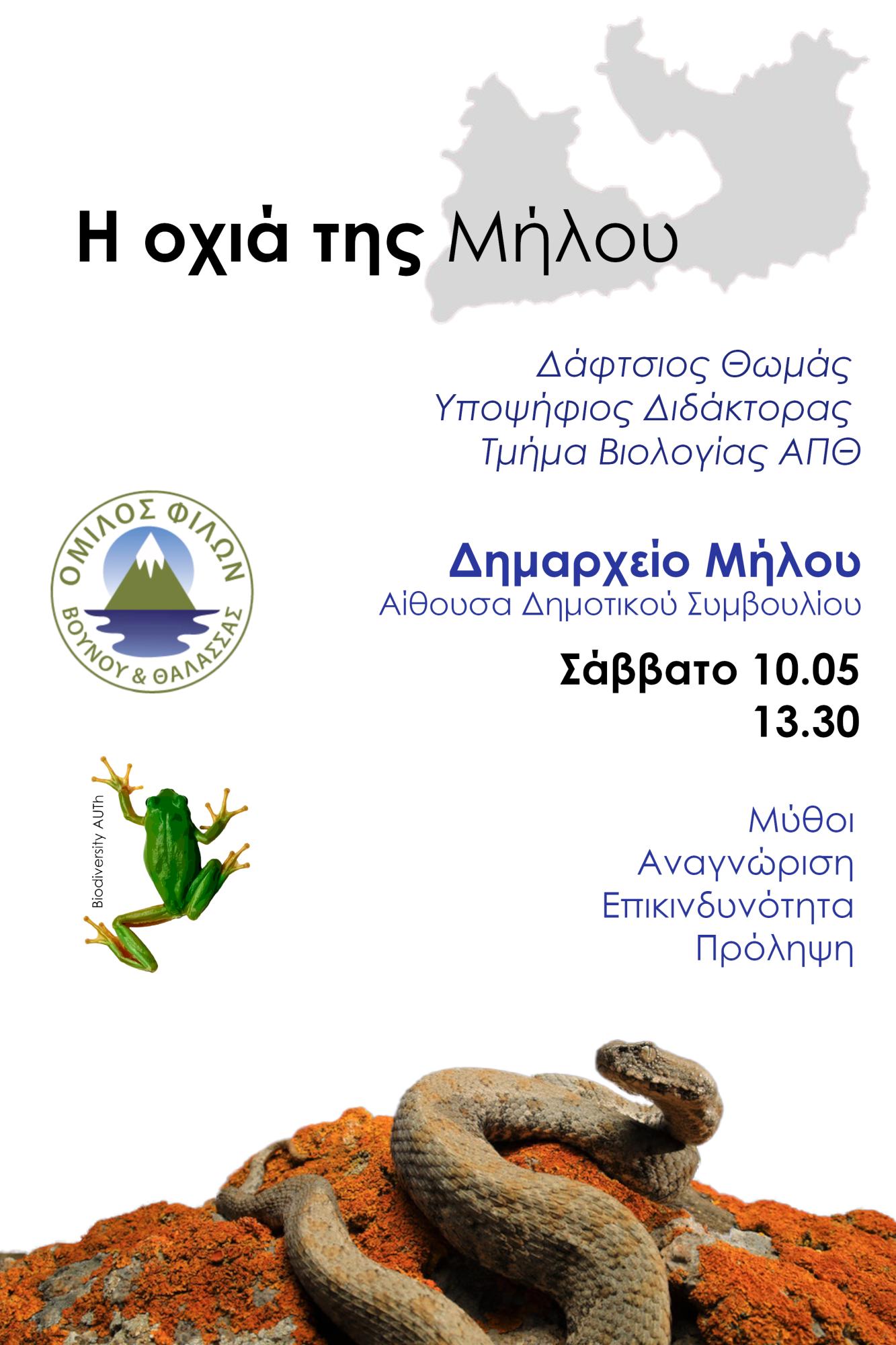Ο Όμιλος Φίλων Βουνού και Θάλασσας Μήλου ανακοινώνει την πραγματοποίηση εκδήλωσης με θέμα « Η οχιά της Μήλου» ( Μύθοι, επικινδυνότητα, αναγνώριση, πρόληψη ). Θα ακολουθήσει συζήτηση για το θέμα.