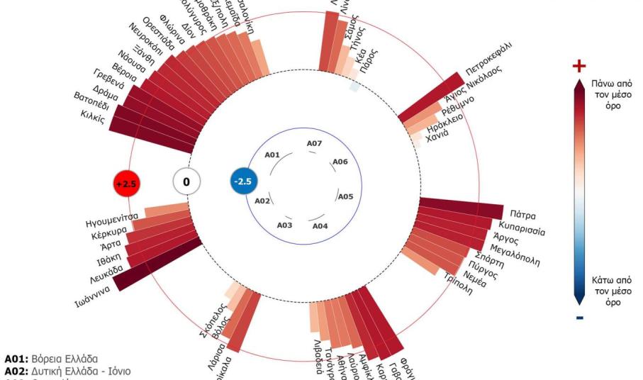 Ο Ιούνιος του 2025 χαρακτηρίστηκε από σταθερά υψηλές θερμοκρασίες, με λίγα επεισόδια πρόσκαιρης πτώσης της θερμοκρασίας κοντά ή και λίγο κάτω από τον μέσο όρο της περιόδου 2010–2019. Ο χάρτης που ακολουθεί δείχνει τις αποκλίσεις της μέσης μέγιστης θερμοκρασίας για τον Ιούνιο 2025 ανά γεωγραφικό διαμέρισμα: