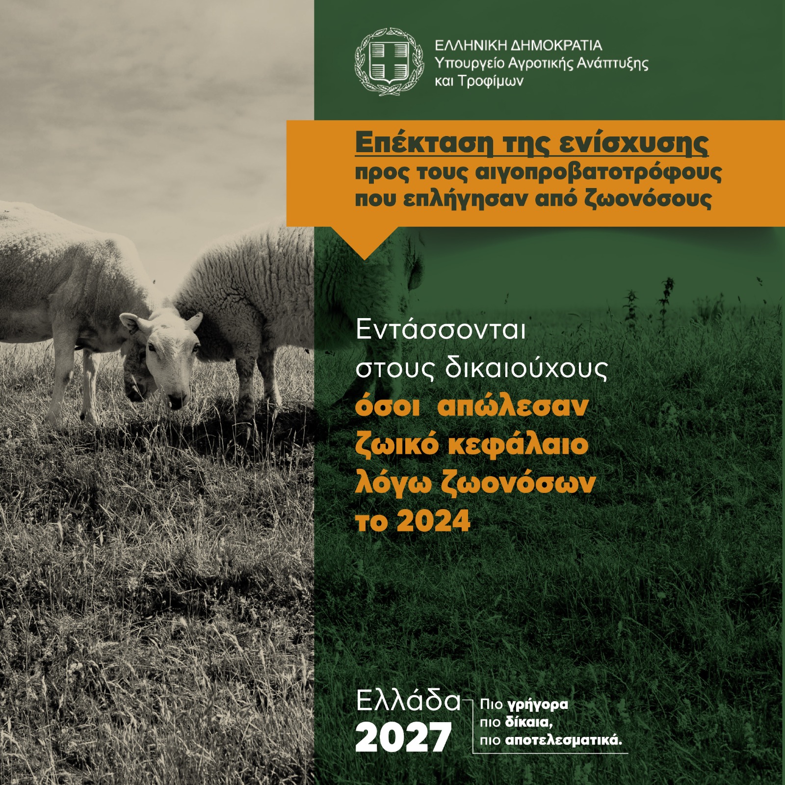Το Υπουργείο Αγροτικής Ανάπτυξης και Τροφίμων, σε συνεργασία με το Υπουργείο Οικονομικών, προχωρά στην τροποποίηση της ΚΥΑ για την ενίσχυση των κτηνοτρόφων, συνολικού ύψους 63 εκατομμυρίων ευρώ, εντάσσοντας στο πεδίο των δικαιούχων τους κτηνοτρόφους που απώλεσαν ζωικό κεφάλαιο λόγω ζωονόσων το 2024.