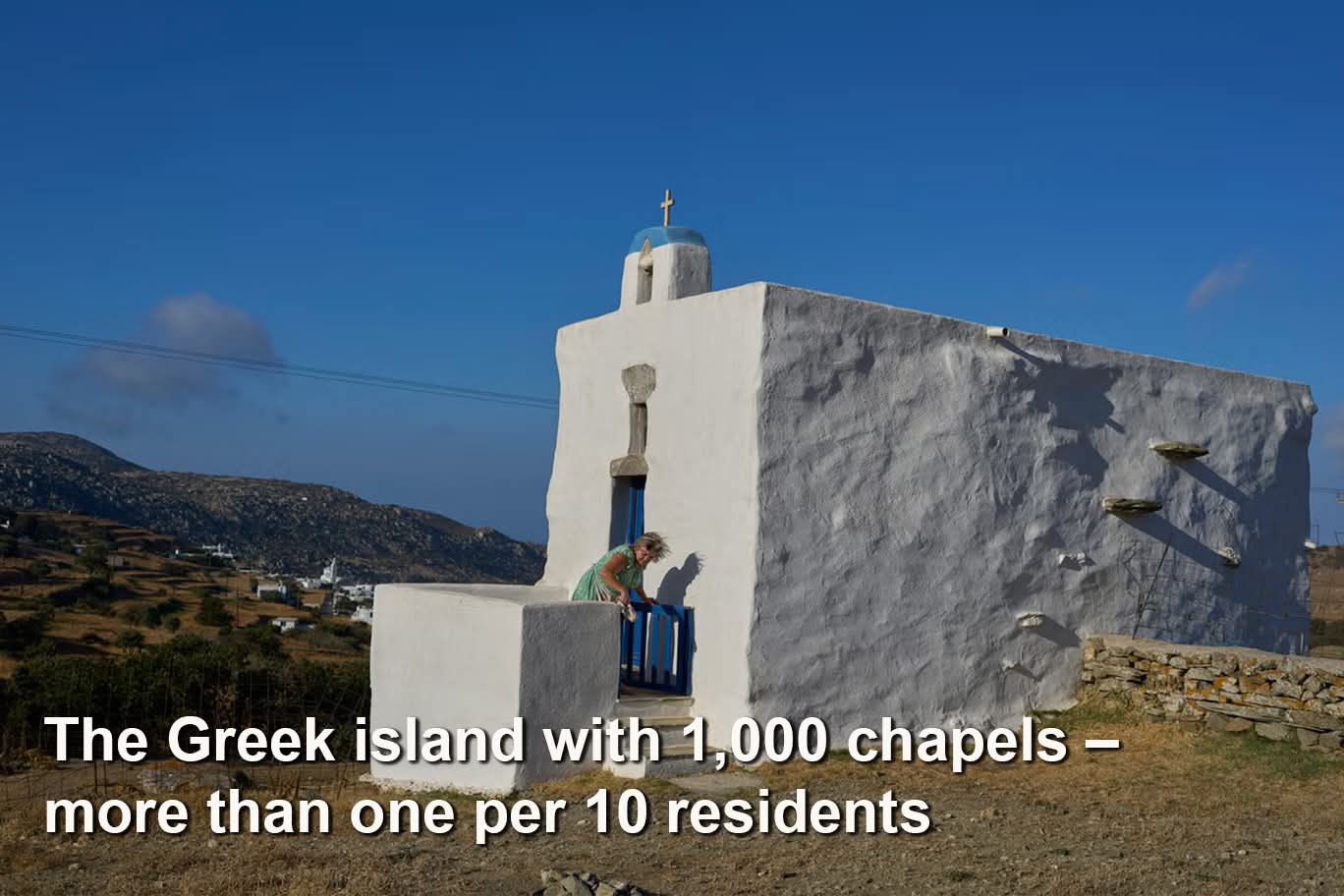 Bernadette Foskolos cleans her Agios Athanasios family-owned chapel at the village of Steni, on the island of Tinos, Greece, Saturday, Sept. 6, 2025. (AP Photo/Petros Giannakouris) (Copyright 2025 The Associated Press. All rights reserved)