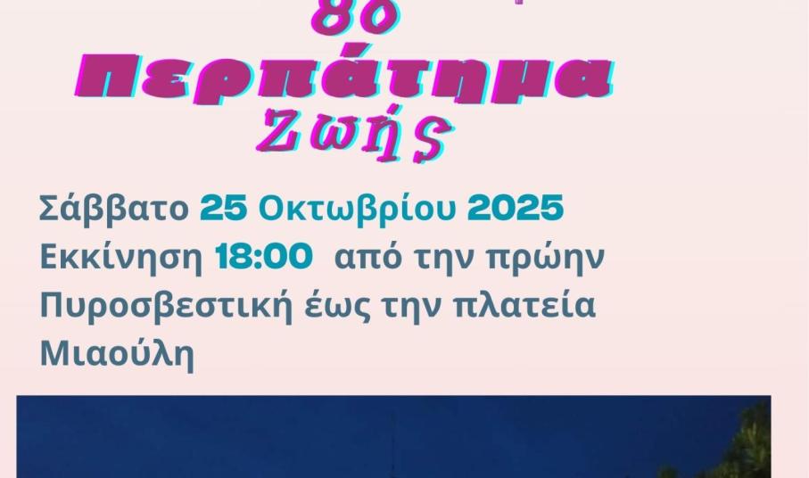 Η εκδήλωση θα πραγματοποιηθεί το Σάββατο 25 Οκτωβρίου 2025, με εκκίνηση στις 18:00 από την πρώην Πυροσβεστική και τερματισμό στην πλατεία Μιαούλη.