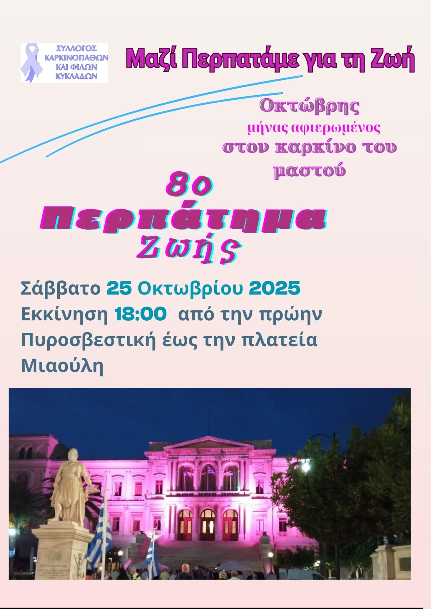 Ο Σύλλογος Καρκινοπαθών και Φίλων Κυκλάδων διοργανώνει το 8ο Περπάτημα Ζωής, μια δράση αφιερωμένη στην ενημέρωση και ευαισθητοποίηση για τον καρκίνο του μαστού, στο πλαίσιο του Οκτωβρίου, μήνα πρόληψης.