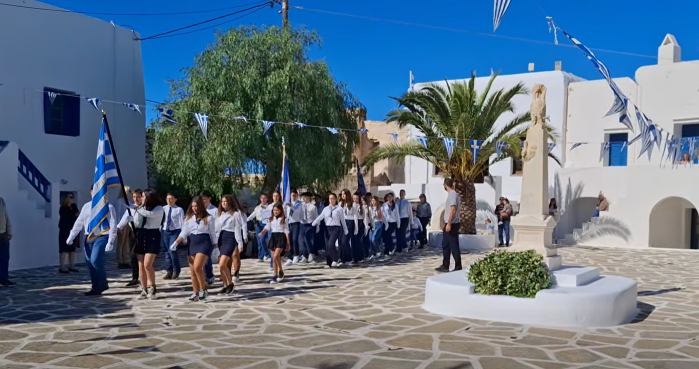 Στη Σίκινο οι μαθητές νηπιαγωγείου – δημοτικού – γυμνασίου και λυκείου ανέρχονται σε 14, αλλά στη φετινή παρέλαση για την εθνική επέτειο της 28ης Οκτωβρίου είχαν καλή παρέα: Συμμαθητές τους από το δεύτερο Γυμνάσιο Ελληνικού.