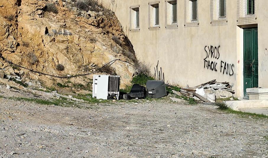 Απερίγραπτη είναι η κατάσταση που επικρατεί στον χώρο πλησίον της εισόδου του γηπέδου ποδοσφαίρου στην Άνω Σύρο, καθώς έχουν πεταχθεί αυθαίρετα, άχρηστα αντικείμενα και εξοπλισμός που πλέον δεν χρησιμοποιείται, διαμορφώνοντας επί της ουσίας έναν μικρό σκουπιδότοπο.
