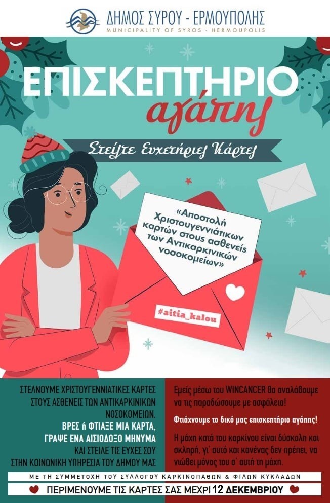 Ο Δήμος Σύρου -Ερμούπολης αγκαλιάζει το «Επισκεπτήριο Αγάπης» συμμετέχοντας και φέτος στην συγκινητική αυτή πρωτοβουλία. Καλούμε όλους και όλες να ανοίξουν την καρδιά τους και να στείλουν ένα μήνυμα ελπίδας και αγάπης σε όσους συνανθρώπους μας θα περάσουν τις φετινές γιορτές στα αντικαρκινικά νοσοκομεία. Οι γιορτές στα νοσοκομεία μπορεί να είναι μοναχικές.