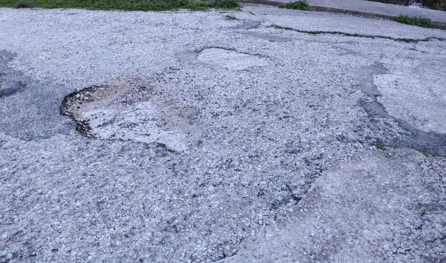 Εκτός όμως από τις λακκούβες, την ίδια εικόνα, ή ίσως ακόμη και χειρότερη, παρουσιάζει συνολικότερα το οδόστρωμα, καθώς η πρόχειρη τσιμεντόστρωση που είχε πέσει, έχει φθαρεί σε μεγάλο βαθμό, δημιουργώντας προβλήματα ολισθηρότητας των οχημάτων.