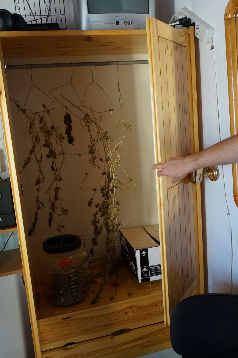 Επιπρόσθετα, στην πρώτη κατοικία εντοπίστηκε στο δεύτερο όροφο ειδικά διαμορφωμένος χώρος (αυτοσχέδιο θερμοκήπιο) μέσα στον οποίο καλλιεργούσε επιμελώς φυτά κάνναβης, υπό ελεγχόμενες περιβαλλοντικές συνθήκες (υγρασίας – φωτισμού - θερμότητας) με χρήση τεχνιτών μέσων και λιπασμάτων, ενώ στο ισόγειο αντίστοιχος χώρος (ξύλινη ντουλάπα) αποξηραντήριο των φυτών κάνναβης.