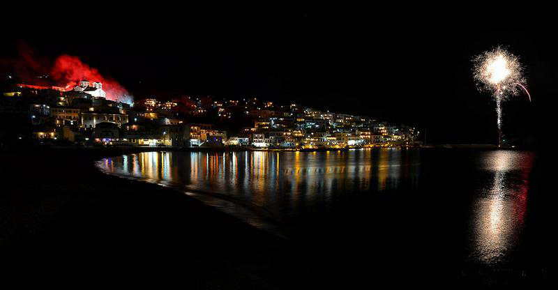 Στο νησί των καπεταναίων και των καραβοκύρηδων ξεχώρισαν οι τοπικές νοστιμιές και τα “βροντερά” έθιμα. Ο εορτασμός κορυφώθηκε με τα αμέτρητα βεγγαλικά και τις κροτίδες, που έκαναν εντυπωσιακό το βράδυ της Ανάστασης. Μετά την περιφορά των εικόνων της Ανάστασης στα σοκάκια του χωριού από τις δυο ενορίες όλοι οι κάτοικοι και οι επισκέπτες συγκεντρώθηκαν στην πλατεία του χωριού και έδωσαν το σύνθημα για να σκάσουν τα “μάσκουλα” με έναν εκκωφαντικό κρότο.