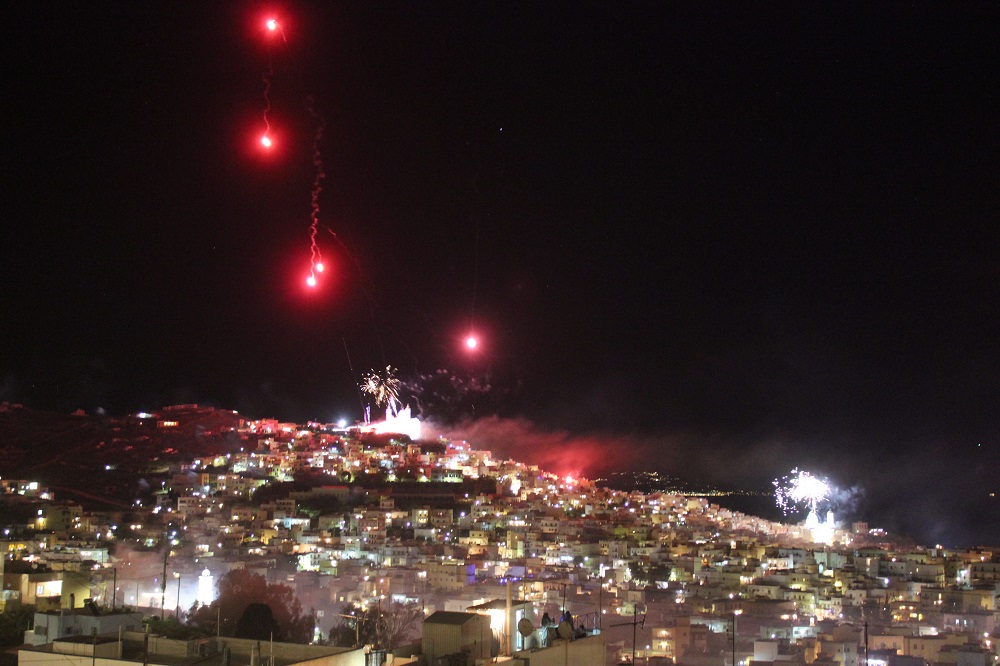 Το βράδυ του Μεγάλου Σαββάτου, ακούσθηκε το “Χριστός Ανέστη” με τους πιστούς και κυρίως τους νέους, να “στολίζουν” με χρώματα τον ουρανό από τις κροτίδες και τα βεγγαλικά, μεταδίδοντας το χαρμόσυνο μήνυμα της Ανάστασης. Αξίζει να αναφερθεί, πως ο εορτασμός του Πάσχα στη Σύρο, ολοκληρώθηκε με την Ακολουθία του εσπερινού της Αγάπης στον Ιερό Ναό Κοιμήσεως της Θεοτόκου, χοροστατούντος του κκ. Δωροθέου Β΄.