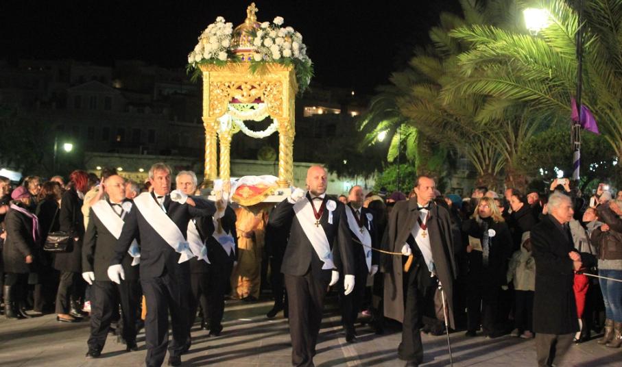 Μοναδικές εικόνες θρησκευτικής μεγαλοσύνης αντίκρισαν οι πιστοί και φέτος, κατά τη διάρκεια της περιφοράς των Επιταφίων των Ιερών Ναών της Ερμούπολης, με την καθιερωμένη συνάντησή τους στην πλατεία Μιαούλη να κερδίζει τα βλέμματα όλων. Παρά το κρύο, ο κόσμος ακολούθησε τις πομπές των Ιερών Ναών Μεταμόρφωσης του Σωτήρος, Αγίου Νικολάου και Κοιμήσεως της Θεοτόκου σε όλες τις οδούς της Ερμούπολης, από όπου και διήλθαν οι Επιτάφιοι, φθάνοντας μπροστά από το Δημαρχιακό Μέγαρο. Εκεί, αναπέμφθηκε δέηση και εκφωνήθηκε ομιλία από τον κκ. Δωρόθεο Β΄, ενώ εγκώμια έψαλε η χορωδία του Ιερού Ναού του Αγίου Νικολάου. Την περιφορά του Επιταφίου από τον Μητροπολιτικό Ναό έως και την πλατεία, πλαισίωσε και η Δημοτική Φιλαρμονική προσδίδοντας ακόμη μεγαλύτερη λαμπρότητα. Από κατοικίες φωτισμένες οι πιστοί σε κάθε γωνιά της πόλης, έραναν με ροδοπέταλα τους Επιτάφιους, εκφράζοντας τη βαθιά πίστη τους το βράδυ της Μεγάλης Παρασκευής, της πιο θλιβερής ημέρας τους χρόνου.