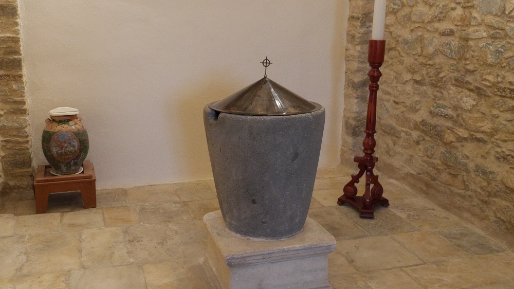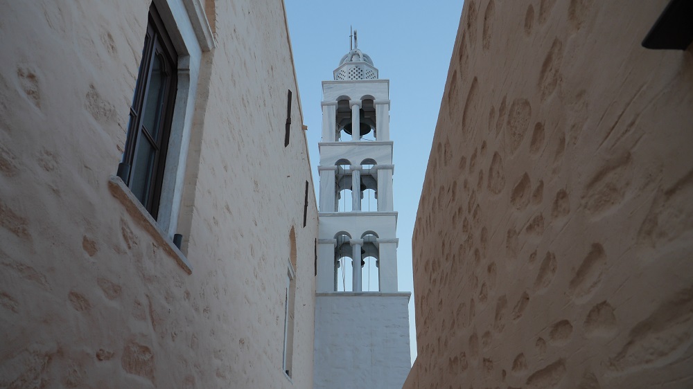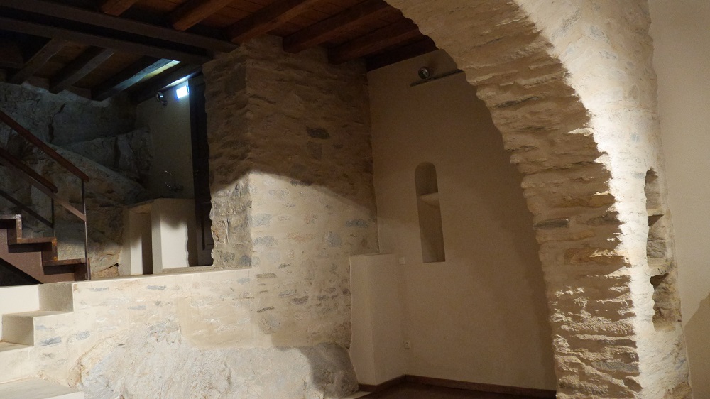 “Το έργο ολοκληρώθηκε τώρα, ουσιαστικά τρία χρόνια μετά από τον Φεβρουάριο του 2012, οπότε και ξεκίνησε η εργολαβία να αποκαθιστά και να συντηρεί το Εκκλησιαστικό Συγκρότημα. Οι μελέτες και η προεργασία είχαν ξεκινήσει από το 2003. Ο τότε Επίσκοπος μου είπε ότι ο Ναός κατέρρεε κι έπρεπε κάτι να κάνουμε. Ξεκινήσαμε τότε και κάναμε αποτύπωση. Έφερα κάποιους σπουδαστές μου, στη συνέχεια κάναμε τη μελέτη, κάναμε λεπτομερή έρευνα όλης της ιστορίας του Ναού, αλλά συνολικά για ό,τι είχε γίνει εδώ, καθώς αυτός είναι ο πέμπτος Ναός που χτίστηκε από το 1832 μέχρι το 1834, οπότε κι έγιναν τα εγκαίνιά του. Προσπαθήσαμε να βρούμε χρηματοδότες. Πλησιάσαμε το Ίδρυμα Νιάρχου. Μας είπαν ότι δέχονται αλλά έπρεπε να έχουμε έτοιμες άδειες. Έως ότου να βγάλουμε τις άδειες πέρασαν δύο, τρία χρόνια. Όταν οι άδειες ήταν έτοιμες το Ίδρυμα Νιάρχου είχε δεσμευθεί σε άλλα μεγάλα έργα κι επομένως ήμασταν στον αέρα. Εκείνη τη στιγμή βοήθησε πολύ ο ίδιος ο Άγιος Γεώργιος. “Έριξε” έναν κεραυνό, χτυπήθηκε το καμπαναριό και συγκλονίστηκε ολόκληρο το νησί, καθώς χάλασε ένα από τα δύο κοσμήματα των λόφων. Καταφέραμε λοιπόν και περάσαμε το έργο στο ΕΣΠΑ. Φορέας χρηματοδότησης του έργου, ύψους 3 εκατ. Ευρώ συνολικά είναι η Διαχειριστική Αρχή και φορέας εκτέλεσης του έργου ανέλαβε το ίδιο το Υπουργείο Πολιτισμού, το οποίο και το παρακολούθησε με τους επιβλέποντές του. Τελικά, ξεκίνησε το έργο τον Φεβρουάριο του 2012. Είχαμε μία καθυστέρηση αρκετά σημαντική διότι είχαμε ένα θέμα για το πώς θα περνούσε ο γερανός και τα τόσο μεγάλα γερανοφόρα προκειμένου να εγκατασταθούν εδώ. Τελικά επιλύθηκε κι αυτό και ξεκίνησαν οι εργασίες από το καλοκαίρι και μετά”.
