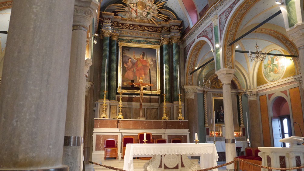 “Δώσαμε έμφαση στο να αποκατασταθεί η αρχική μορφή και η λειτουργία που είχε το Συγκρότημα. Ο Ναός είχε υποστεί πάρα πολλές αλλοιώσεις στην πορεία του, από το 1834 και μετά. Παραδείγματος χάριν το καμπαναριό είχε χτυπηθεί τέσσερις φορές από κεραυνούς και το 1895 το είχαν κατεβάσει και το έχτισαν με μονά τόξα, - όχι όπως είναι τώρα και όπως ήταν στην αρχή – αλλά και με έναν όροφο λιγότερο, κάτι που έκανε τον Ναό να έχει μία εικόνα αντιαισθητική. Σήμερα πλέον, έχουμε ένα πολύ όμορφο καμπαναριό, υπέροχο και μαρμάρινο όπως το σχεδίασε αρχικά ο αρχιτέκτων. Στη συνέχεια, είχαμε πρόγραμμα να ανοίξουμε τα τόξα του πρόναου, ο οποίος ήταν κλειστός και υπήρχε μόνο μία πόρτα κι έμοιαζε με αποθήκη. Πάνω από εκεί φαινόταν ένα ντεπόζιτο νερού. Μία άλλη σοβαρή αποκατάσταση ήταν του ερειπίου που προαναφέραμε, το οποίο είναι ένα κόσμημα για την περιοχή. Αυτά ήταν τα βασικά μας μελήματα. Δεν γνωρίζαμε τί πλούτο έφερε ο διάκοσμος μέσα στον Ναό. Όταν αποκαλύφθηκε μετά τις πρώτες εργασίες των συντηρητών, το ίδιο το Υπουργείο Πολιτισμού ενδιαφέρθηκε έντονα και οι ίδιοι μελέτησαν την παρακάτω πορεία της συντήρησης του εσωτερικού διακόσμου και καταφέραμε και πήραμε μία μικρή επέκταση του αντικειμένου από το ΕΣΠΑ με 300.000 ευρώ ακόμη για να μπορέσουμε να τον αποκαλύψουμε. Όπως μπορεί να δει ο επισκέπτης είναι ο αρχικός διάκοσμος, με τα εμβλήματα των Επισκόπων, καθώς αυτά ήταν χαρακτηριστικά του ποιός ήταν ο στόχος του καθενός. (...). Ο Ναός έχει θησαυρούς που δεν τους είχαμε αξιοποιήσει. Παραδείγματος χάριν οι πίνακες στα τέμπλα είναι ιδιαιτέρως αξιόλογοι καθώς ανήκουν σε γνωστό ζωγράφο. Η “Καρδία του Ιησού” είναι του Γκαλιάρντι, ενός μεγάλου ζωγράφου του 19ου αιώνα που είχε έρθει για να διακοσμήσει τον Άγιο Διονύσιο στην Αθήνα κι έφτιαξε κι αυτούς τους πίνακες. (...). Επίσης η “Παναγία του Ροδαρίου” έχει ιδιαίτερη αξία. (...). Ανακαλύψαμε επίσης, την κορυφή της πυραμίδας επάνω στην οποία εδράζεται ο Ναός. Εκεί λοιπόν, σε αυτήν την πυραμίδα που είναι 188, 16 μέτρα από τη θάλασσα όταν κανείς φθάνει, αναλογίζεται που βρίσκεται. Εκείνο που έχει ενδιαφέρον είναι ότι ο ιστορικός της Σύρας, ο Αμπελάς γράφει κάτι πολύ χαρακτηριστικό: “Ίσταται επί της κορυφής του λόφου ως η κιβωτός επί του Αραράτ. Κι αν δεν υπήρχε αυτή η κιβωτός η ιστορία της νήσου Σύρου ολόκληρη, από των αρχαιοτάτων χρόνων μέχρι τα καθ΄ ημάς, θα είχε εξαφανισθεί”. Και είναι γεγονός καθώς σε αυτό εδώ το μέρος φυλάσσονταν και τα Αρχεία. Όταν κάηκαν τα Αρχεία το 1617, κάηκαν όλα. Κάηκε και το Επισκοπικό Μέγαρο. Έκτοτε όμως υπάρχουν τα πάντα. Έχω βρει το γενεαλογικό δέντρο μου από το 1740 και μάλιστα πριν ψηφιοποιηθεί το Αρχείο. Έως και το 1617 βρίσκει κανείς τις συνέχειες των οικογενειών και τί είχε συμβεί μέχρι τότε. (...)”.