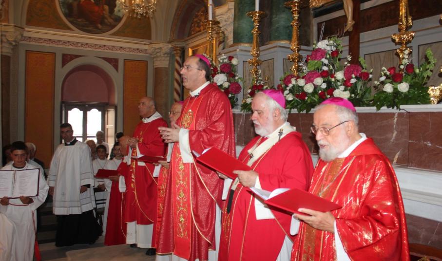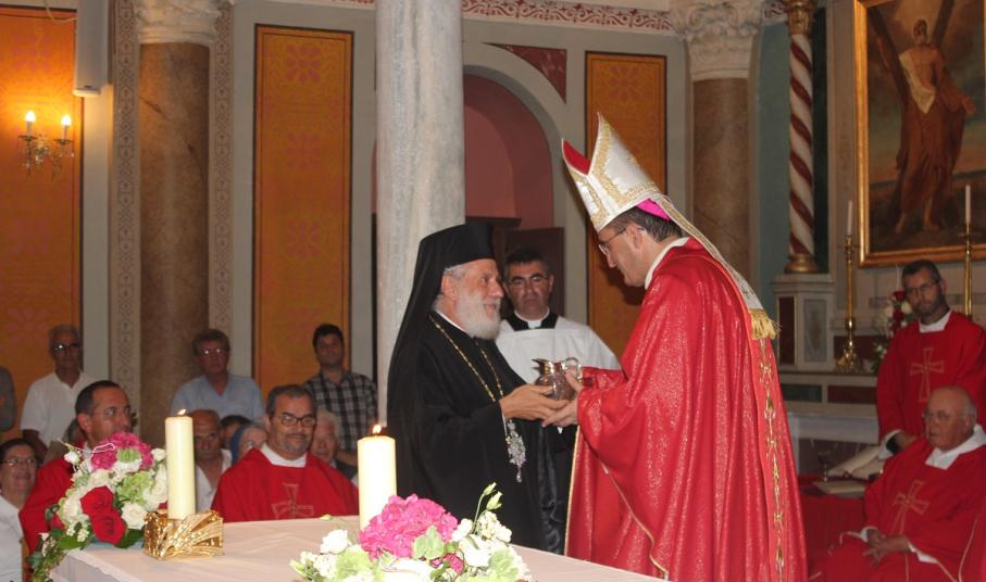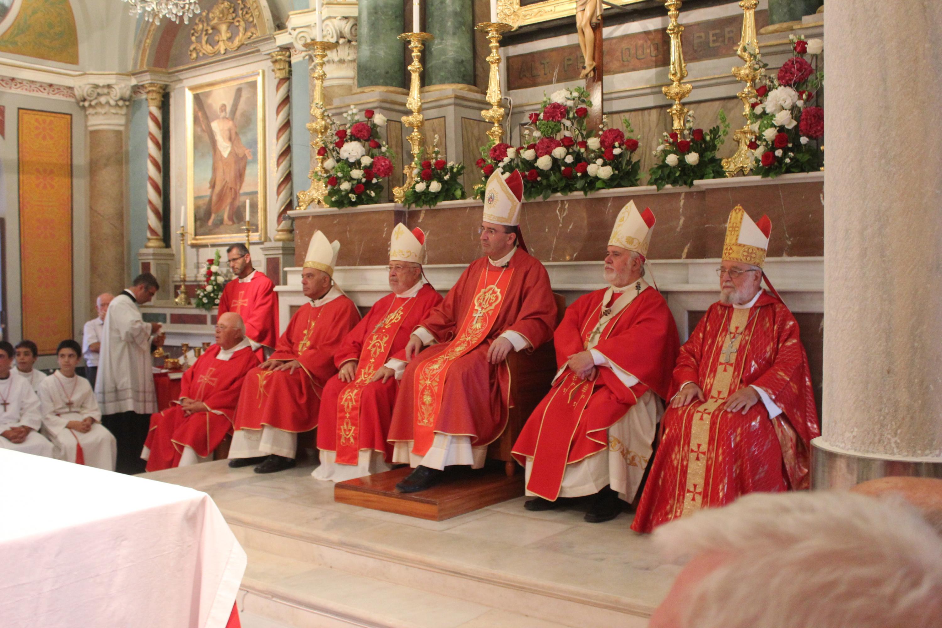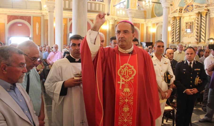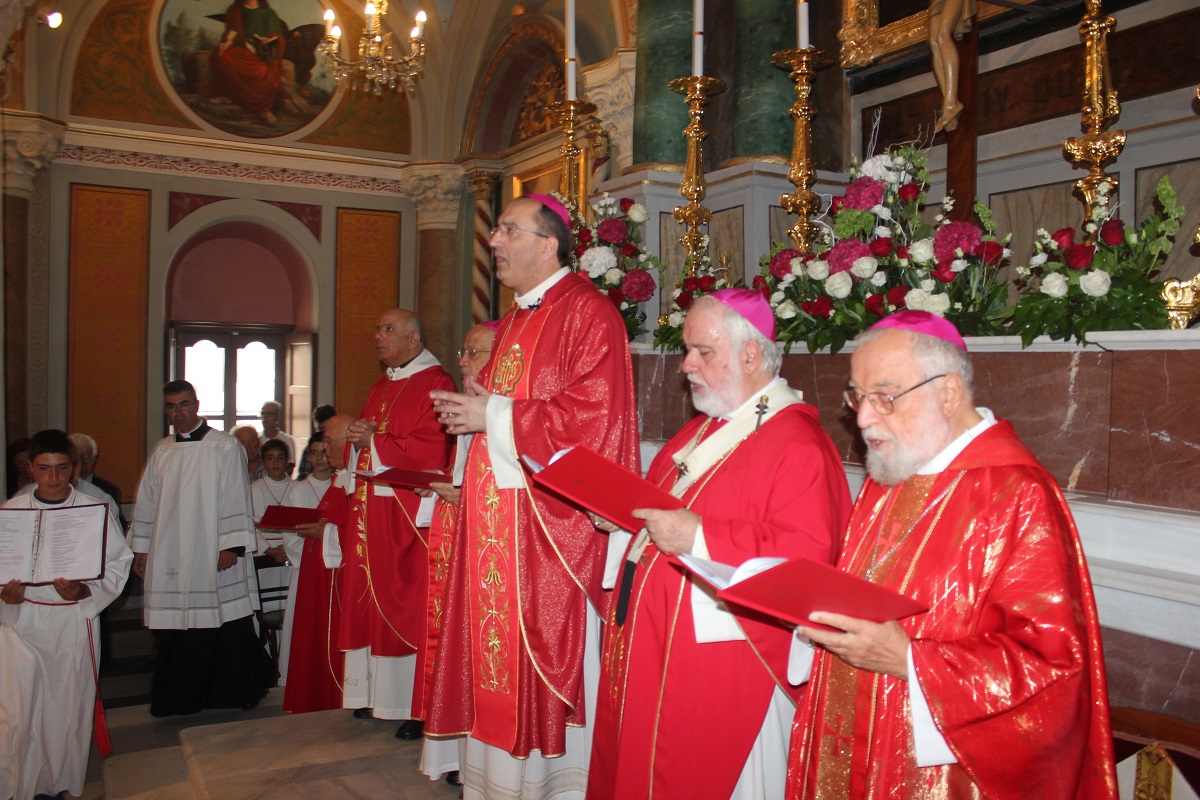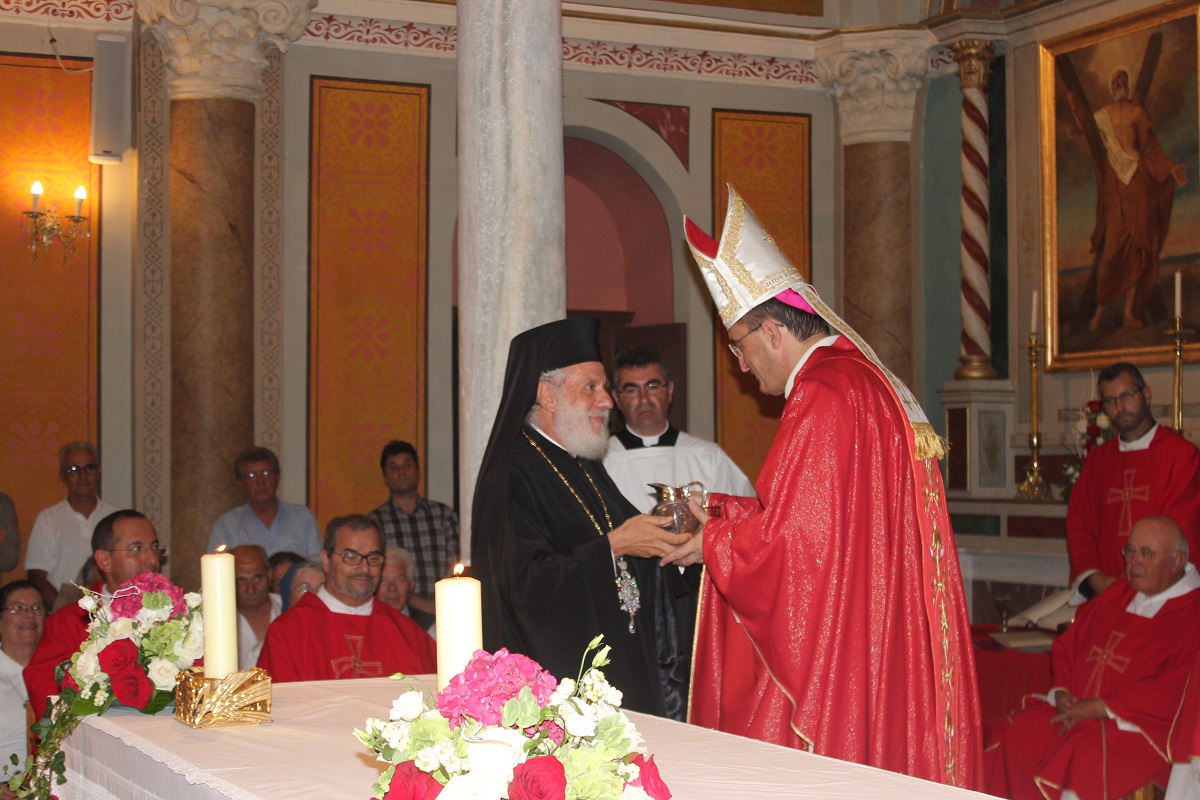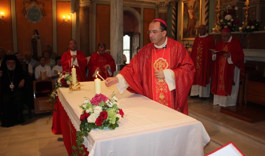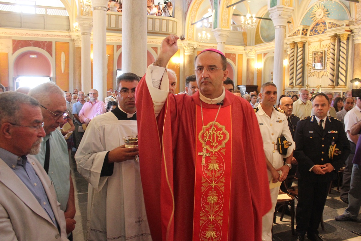 Στην τελετή προΐστατο ο Καθολικός Επίσκοπος Σύρου Σεβασμιώτατος π. Πέτρος Στεφάνου, με Συλλειτουργούς τον Καθολικό Αρχιεπίσκοπο Αθηνών και αποστολικό Τοποτηρητή της Καθολικής Αρχιεπισκοπής Ρόδου π. Σεβαστιανό Ροσσολάτο, τον πρώην Καθολικό Αρχιεπίσκοπο Αθηνών π. Νικόλαο Φώσκολο, τον Σεβασμιώτατο Αρχιεπίσκοπο Νάξου - Τήνου π. Νικόλαο Πρίντεζη, τον πρώην Καθολικό Επίσκοπο Σύρου και σημερινό Πρόεδρο της Ιεράς Συνόδου της Καθολικής Ιεραρχίας της Ελλάδας π. Φραγκίσκο Παπαμανώλη και τους ιερείς της Εκκλησιαστικής Επαρχίας.