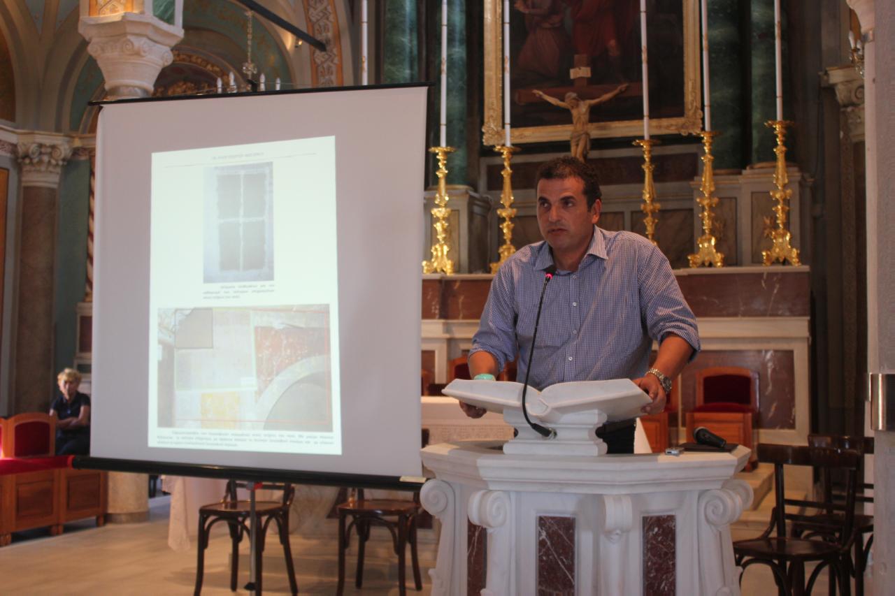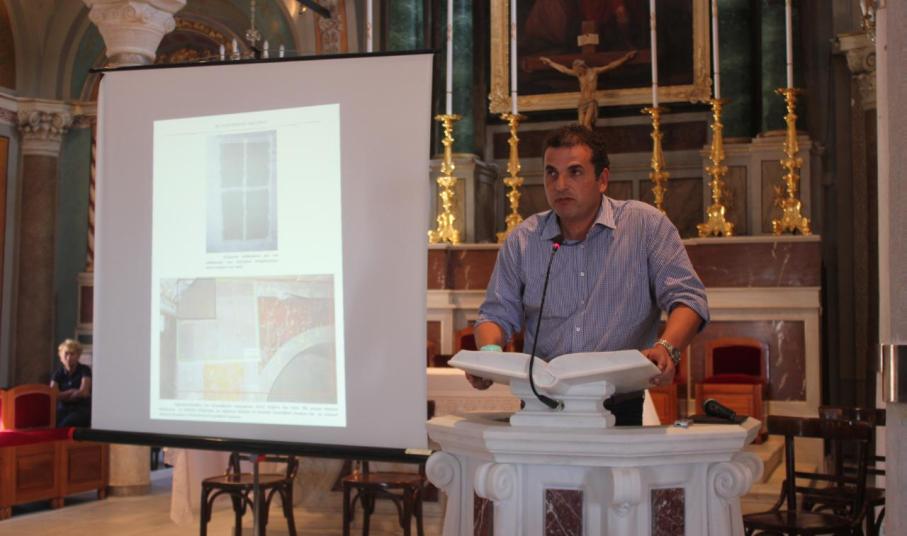 Στη συνέχεια, το λόγο έλαβε ο Συντηρητής αρχαιοτήτων και έργων τέχνης κ. Γιώργος Παυλόπουλος, χάρη στον οποίο εξασφαλίστηκε η επέκταση του προγράμματος χρηματοδότησης ΕΣΠΑ με στόχο την αποκάλυψη του συνολικού διακόσμου.