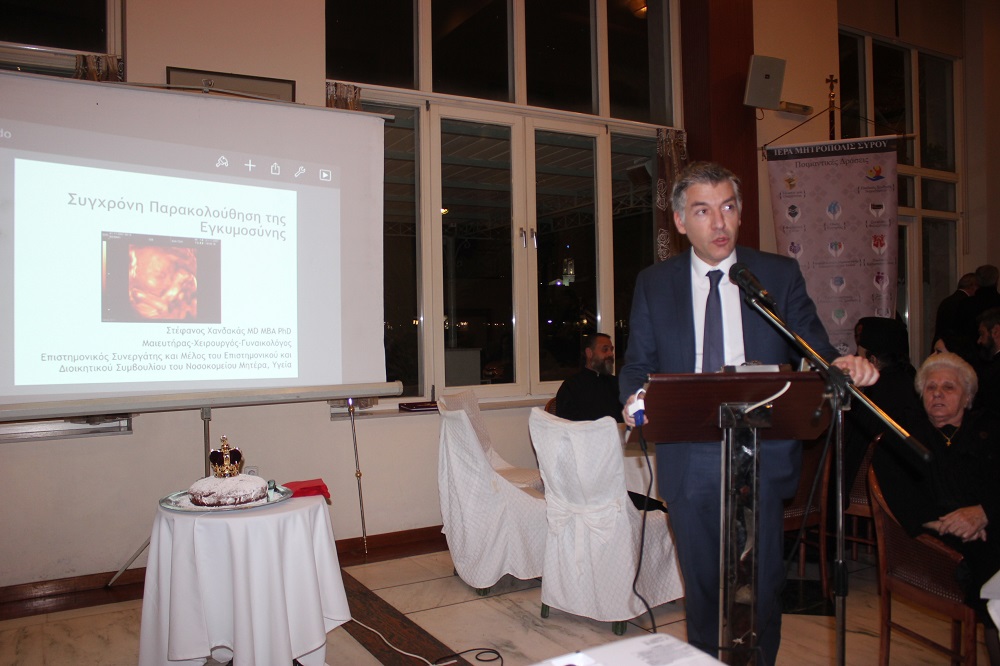 Στην καθιερωμένη εκδήλωση, παρέστη ο διακεκριμένος Συριανός επιστήμονας, Στέφανος Χανδακάς, ο οποίος πραγματοποίησε μία άκρως ενδιαφέρουσα ομιλία με θέμα “Η σύγχρονη παρακολούθηση της εγκυμοσύνης”, με την κόρη του ίδιου, τη μικρή Αλεξάνδρα, να συνοδεύει στη συνέχεια τον Σεβασμιώτατο στην κοπή της αγιοβασιλειόπιτας, όπως συνηθίζει κάθε “αυγή” νέου έτους.