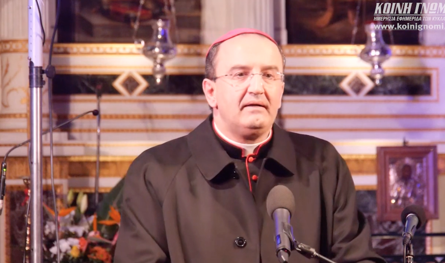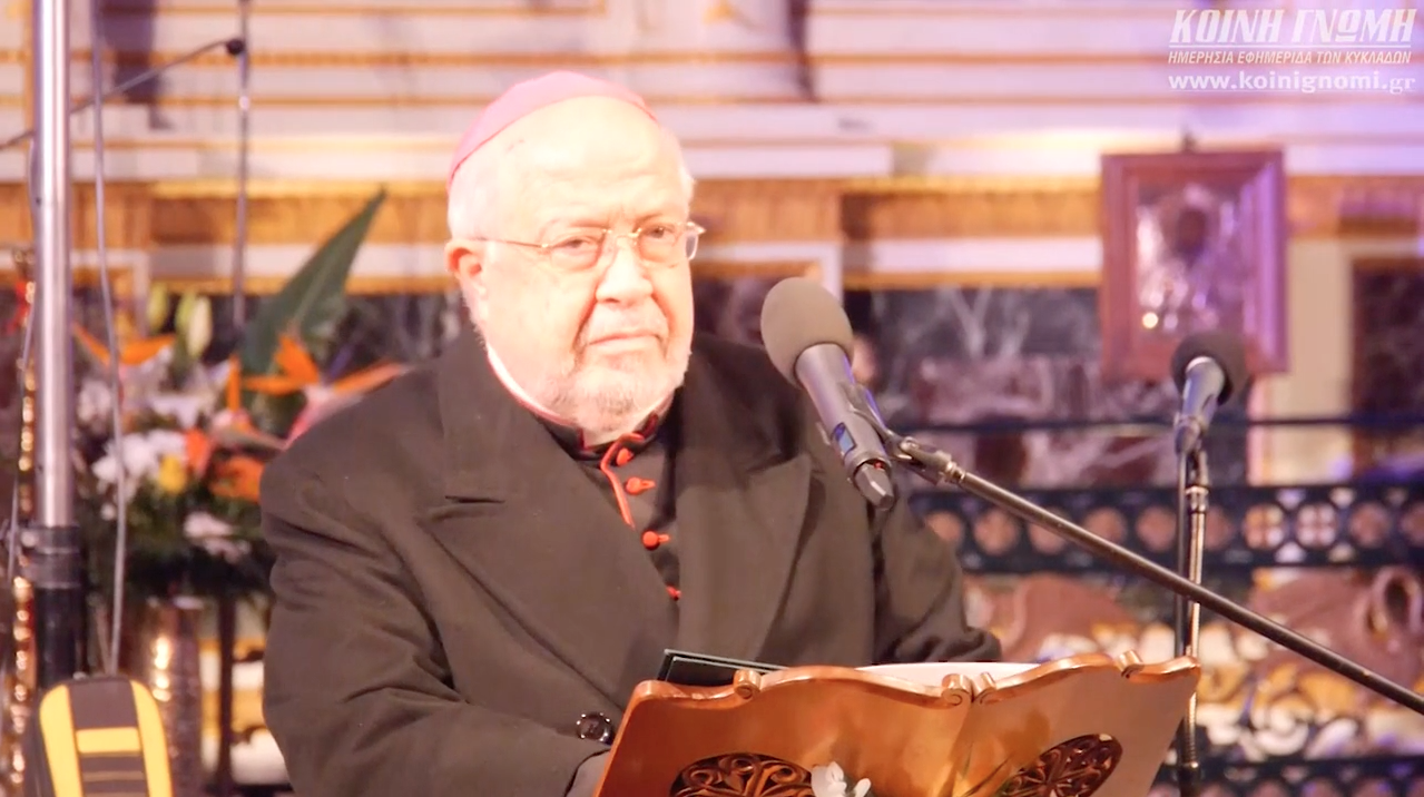 Την ειλικρινή χαρά και ευγνωμοσύνη του για την τιμή που του επιφύλαξε ο Κύριος να συμπορεύεται μαζί με τον Μητροπολίτη Σύρου κ. Δωρόθεο Β’ σε μια πορεία ενότητας και ειρήνης στην καθοδήγηση του ποιμνίου, εξέφρασε με τη σειρά του ο Καθολικός Επίσκοπος Σύρου Σεβ. π. Πέτρος Στεφάνου. Μοιράστηκε μάλιστα μαζί με τους παρευρισκόμενους τις μνήμες τους από την ημέρα εκείνη, όπου ο λαός της Σύρου υποδέχτηκε με ενθουσιασμό τον Σεβασμιώτατο, αναγνωρίζοντας στο πρόσωπό του έναν σπάνιο, συνετό λειτουργό της χριστιανικής πίστης και στοργικό πατέρα, που διακρίνεται για την αγάπη του στο συνάνθρωπο, τη δημιουργικότητά του, αλλά και την πίστη του στον Θεό.