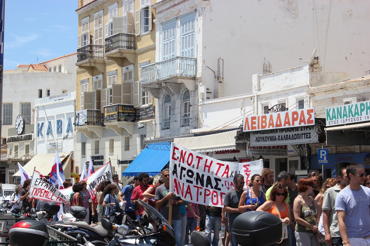 Απογευματινή ώρα επέλεξε να πραγματοποιήσει την κινητοποίησή του, το Εργατικό Κέντρο Κυκλάδων στη Σύρο. Σε αντίθεση με τους υπόλοιπους φορείς, το διοικητικό συμβούλιο κάλεσε όλη την τοπική κοινωνία στην πλατεία Μιαούλη μετά τις επτά ώστε να φανερώσει την αντίθεσή του στο “ξεκλήρισμα” της ΕΡΤ. Ο πρόεδρος του Εργατικού Κέντρου, στην ομιλία του, σημείωσε, “Η τακτική του “Αποφασίζουμε και Διατάσσουμε”, θυμίζει άλλες εποχές και αυτός ο βάναυσος τρόπος, με ΜΑΤ και δυνάμεις καταστολής, να κατεβάζουν τους πομπούς της Κρατικής Ραδιοφωνίας και Τηλεόρασης, δείχνει την αναλγησία της τρικομματικής κυβέρνησης και ότι ο κατήφορος δεν έχει σταματημό”. Σε αυτές τις ενέργειες, το Δ.Σ. καλεί εργαζομένους, συνταξιούχους, ανέργους και φοιτητές να απαντήσουν δυναμικά με την παρουσία τους στους αγώνες.