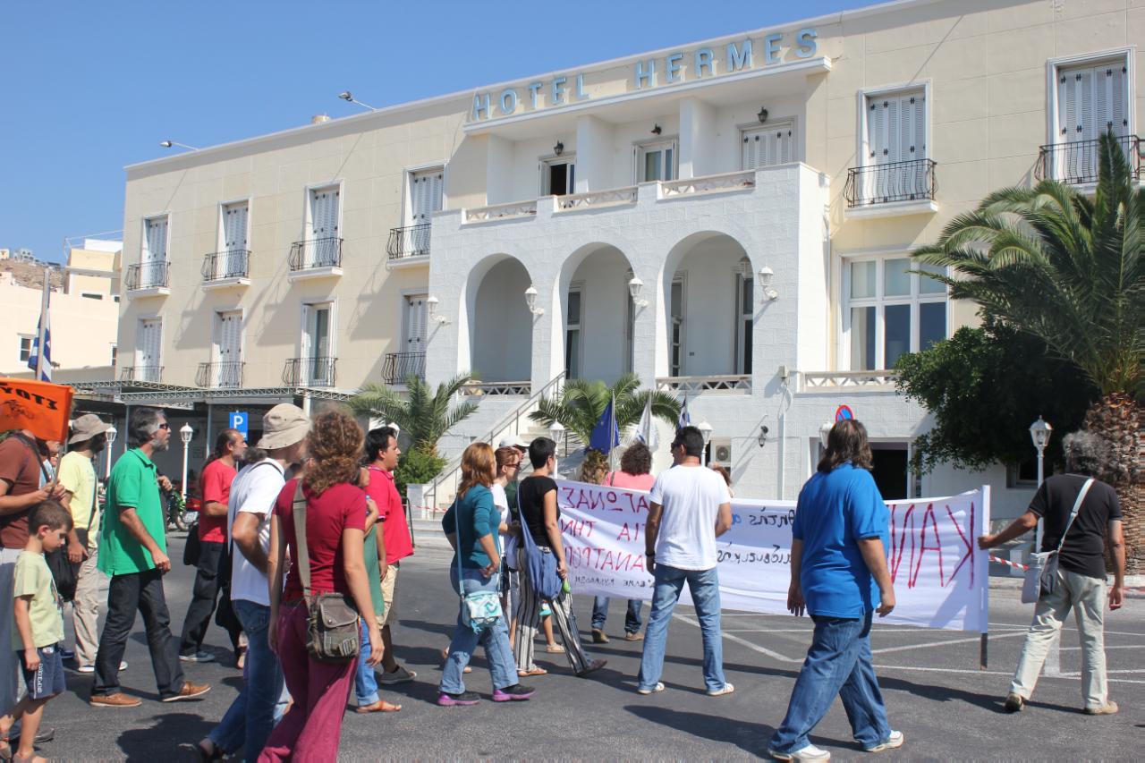 Παρ' όλη τη μικρή συμμετοχή, οι συγκεντρωμένοι πραγματοποίησαν πορεία στο κέντρο της πόλης, με κατεύθυνση το ξενοδοχείο “Ερμής”, όπου σύμφωνα με τις πληροφορίες, πραγματοποιούταν εκείνη την ώρα συνάντηση μεταξύ του υπουργού Εργασίας, Γιάννη Βρούτση, του Δημάρχου Σύρου, Γιάννη Δεκαβάλλα και του Αντιπεριφερειάρχη Κυκλάδων, Γιώργου Πουσσαίου.
